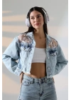 Buz Mavi Lazerli Tül Detay Kot Ceket