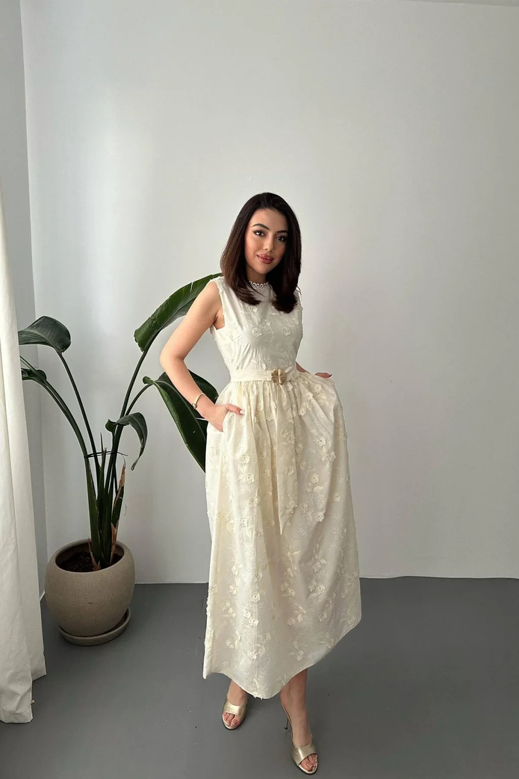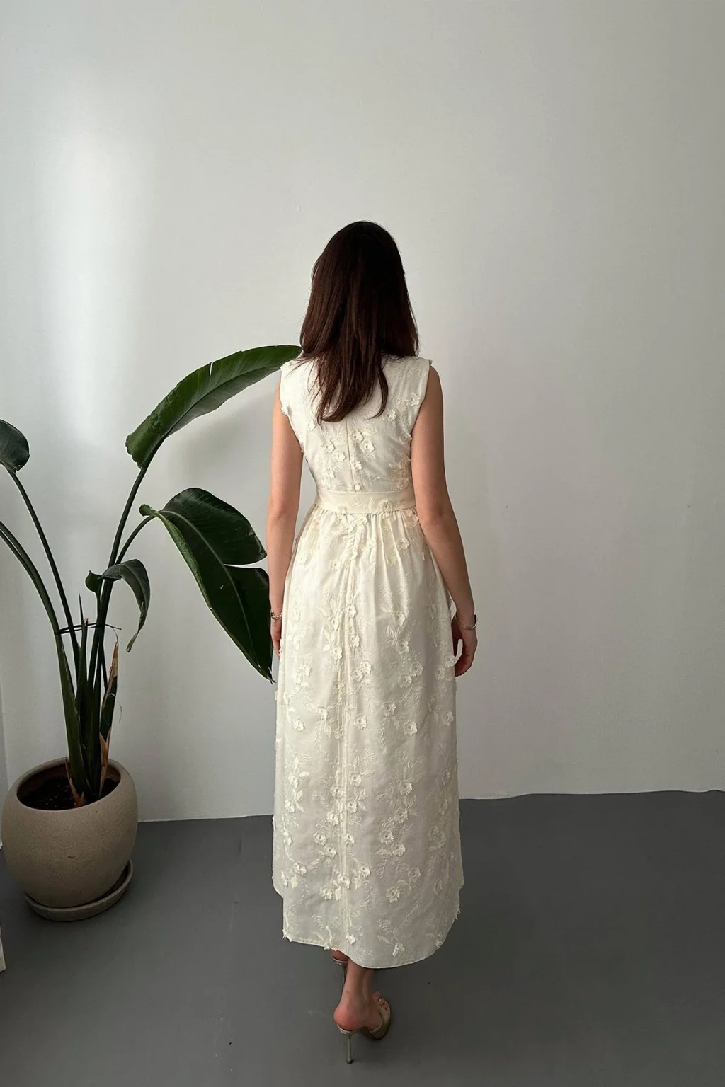 Kadın 3D Brode Detaylı Astarlı Bej Kolsuz Elbise