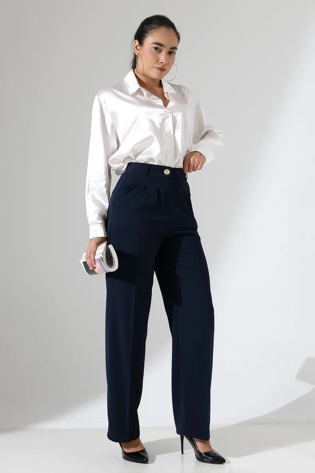 Kadın Arkası Lastikli Yüksek Bel Lacivert Palazzo Pantolon, modern çizgisi ve zarif tasarımı ile günlük kullanım ve özel günler için ideal bir tercihtir. Şık görünümü ve rahat kalıbı sayesinde stilinizi tamamlamanızı sağlar. Kaliteli kumaş yapısı uzun süreli kullanım için uygundur.