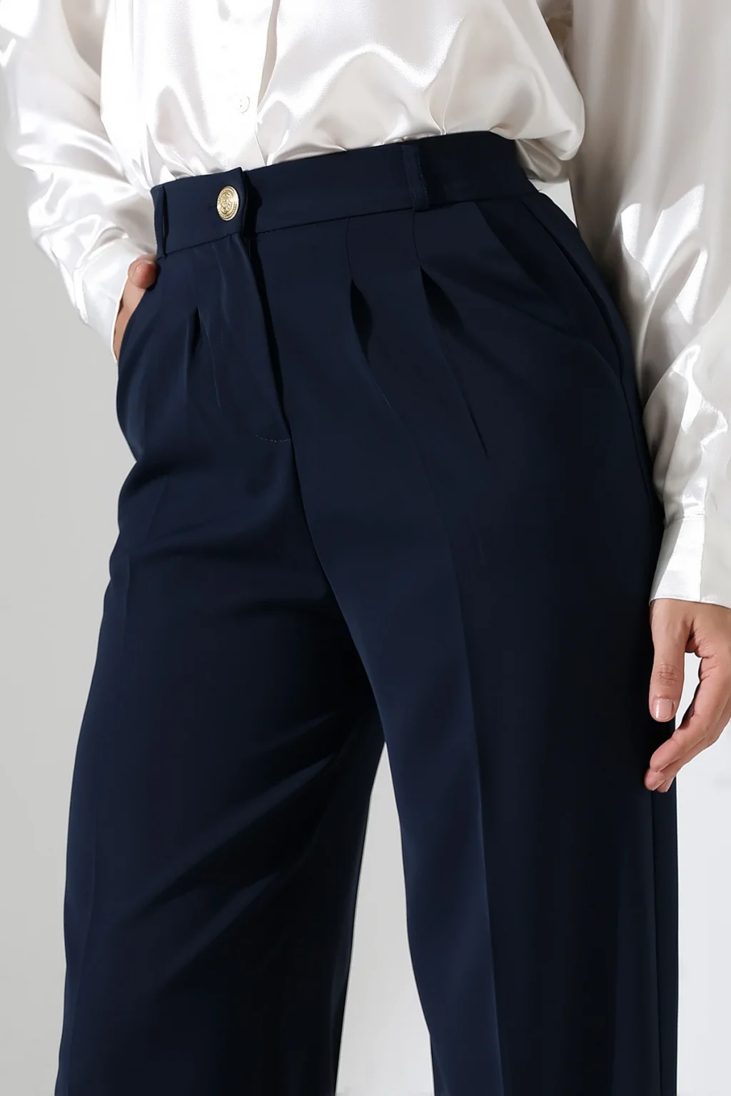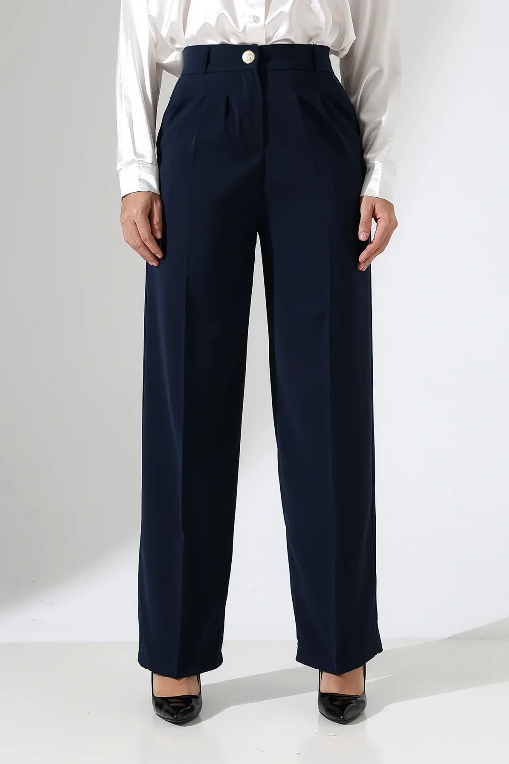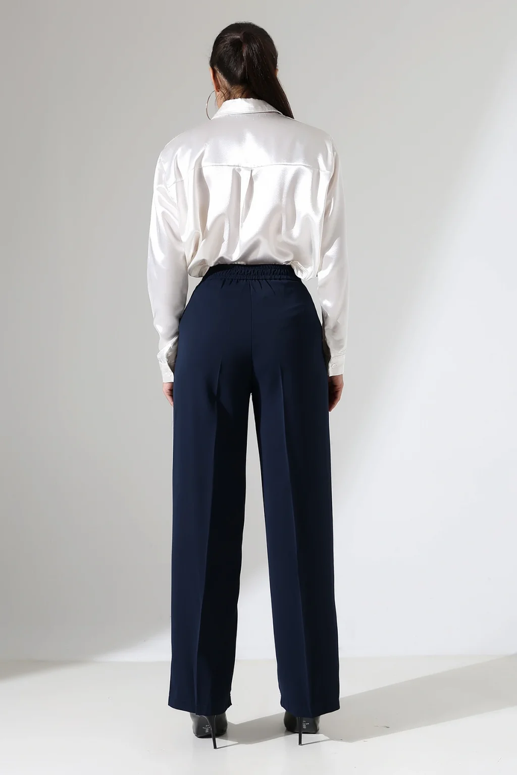 Kadın Arkası Lastikli Yüksek Bel Lacivert Palazzo Pantolon