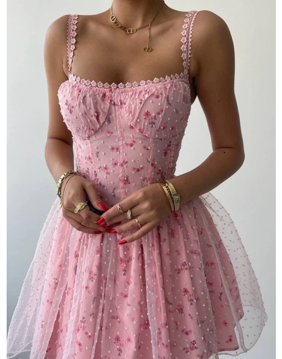 Kadın Askılı Nakış Detay Tüllü Mini Elbise