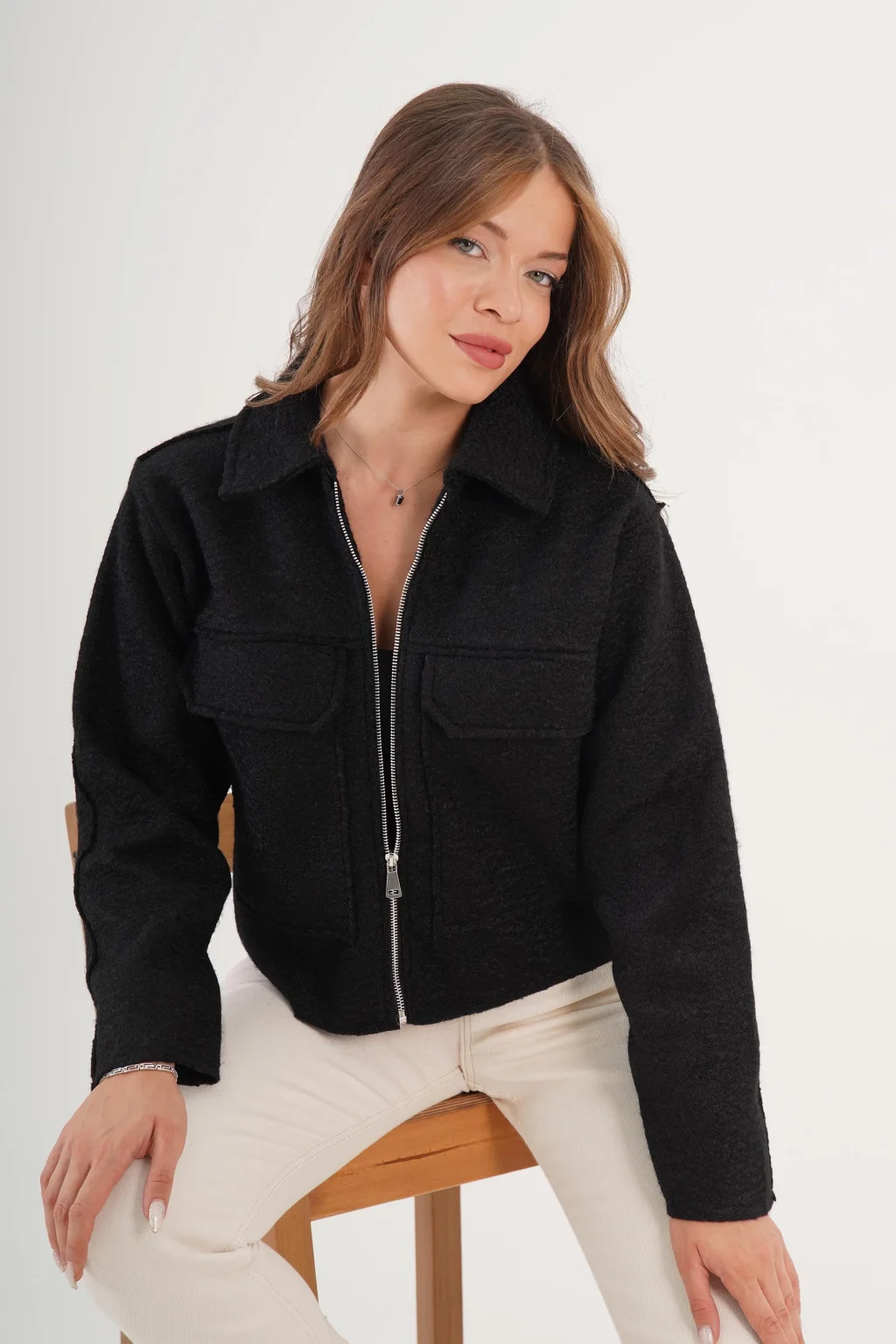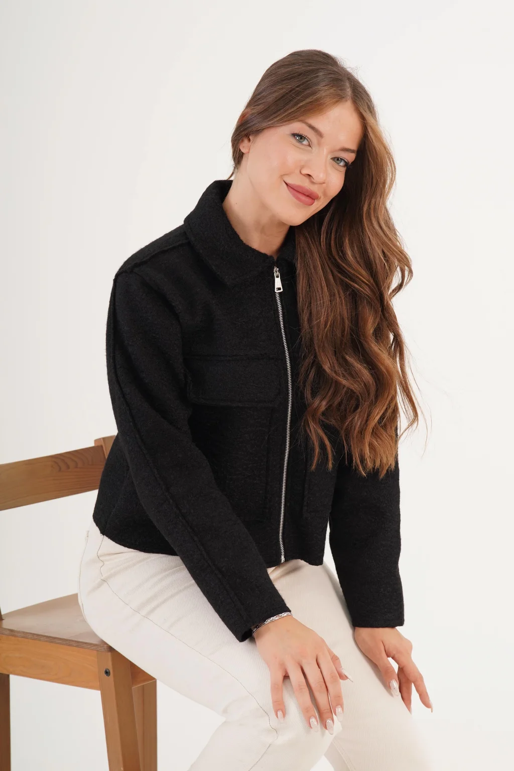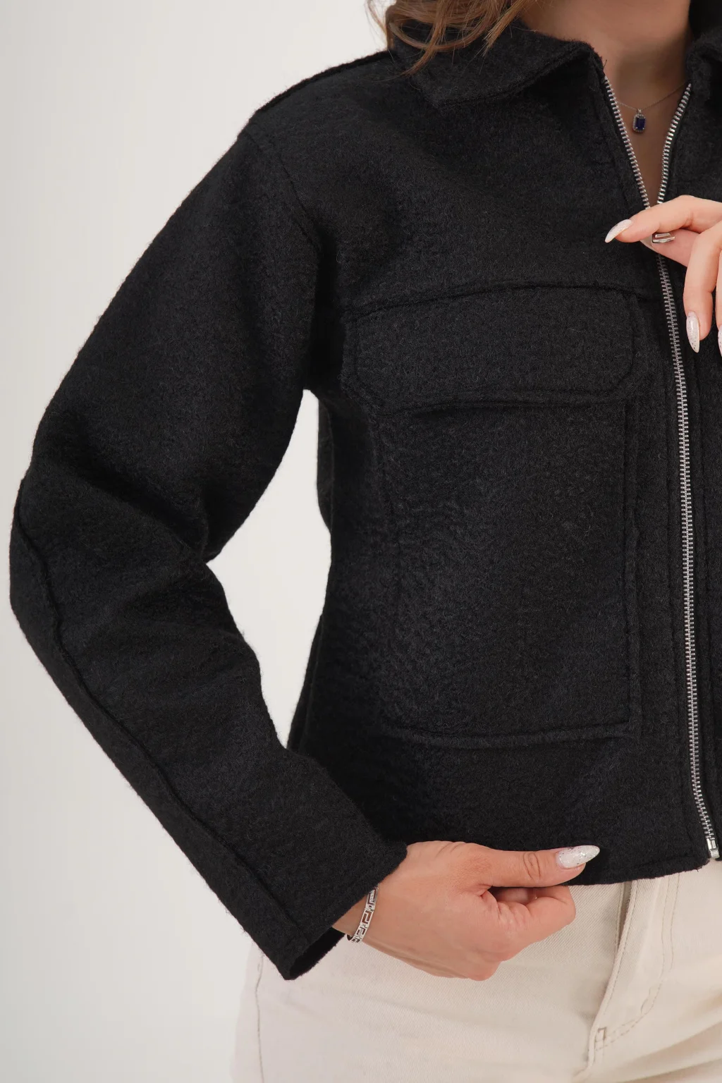 Kadın Buklet Desenli Siyah Kaşe Ceket