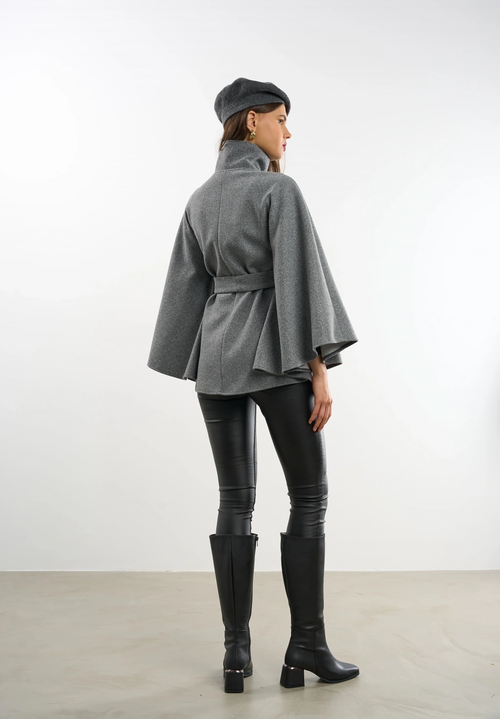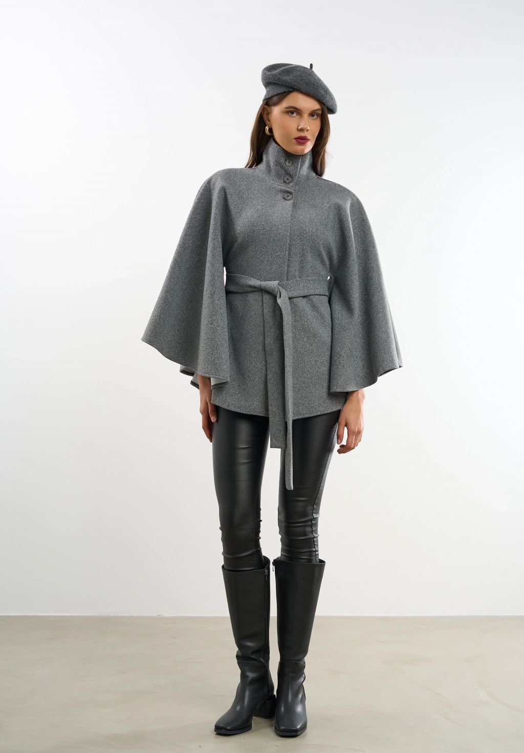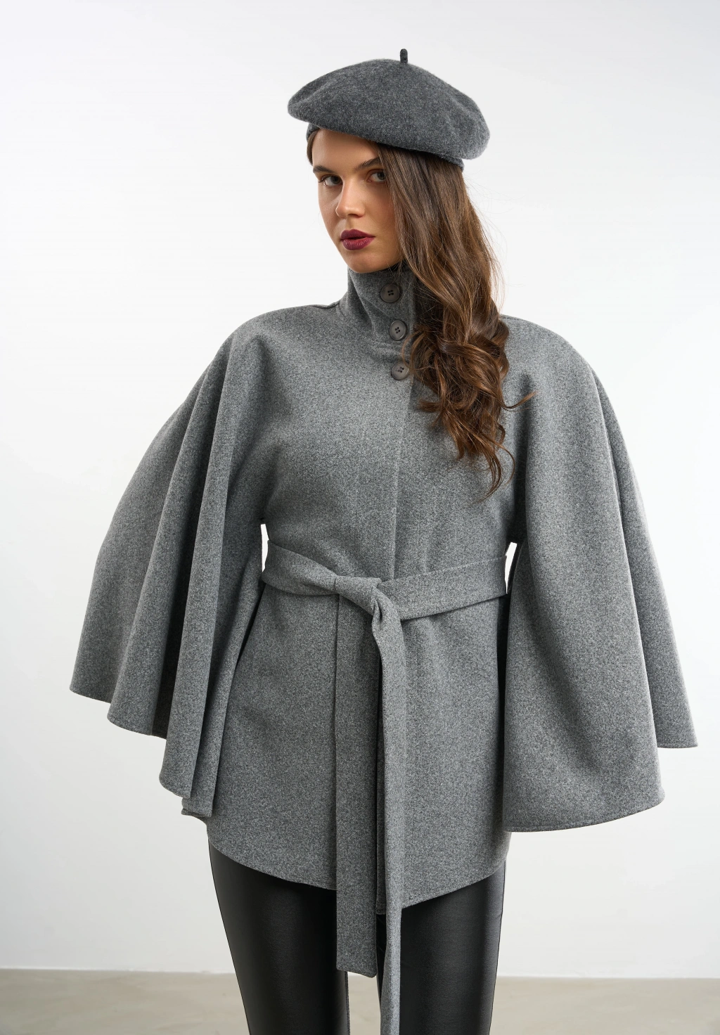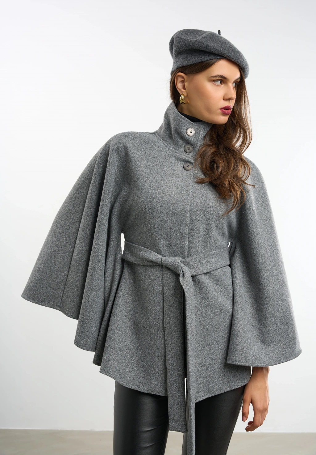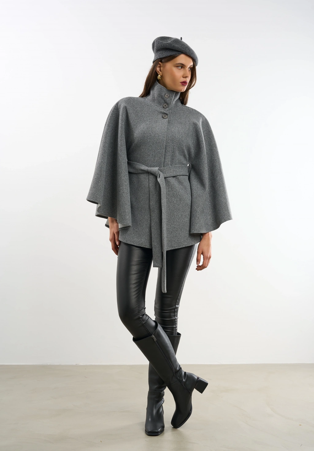 Kadın Gri Kaşe Kumaş Düğmeli Kuşaklı Pelerin Panço