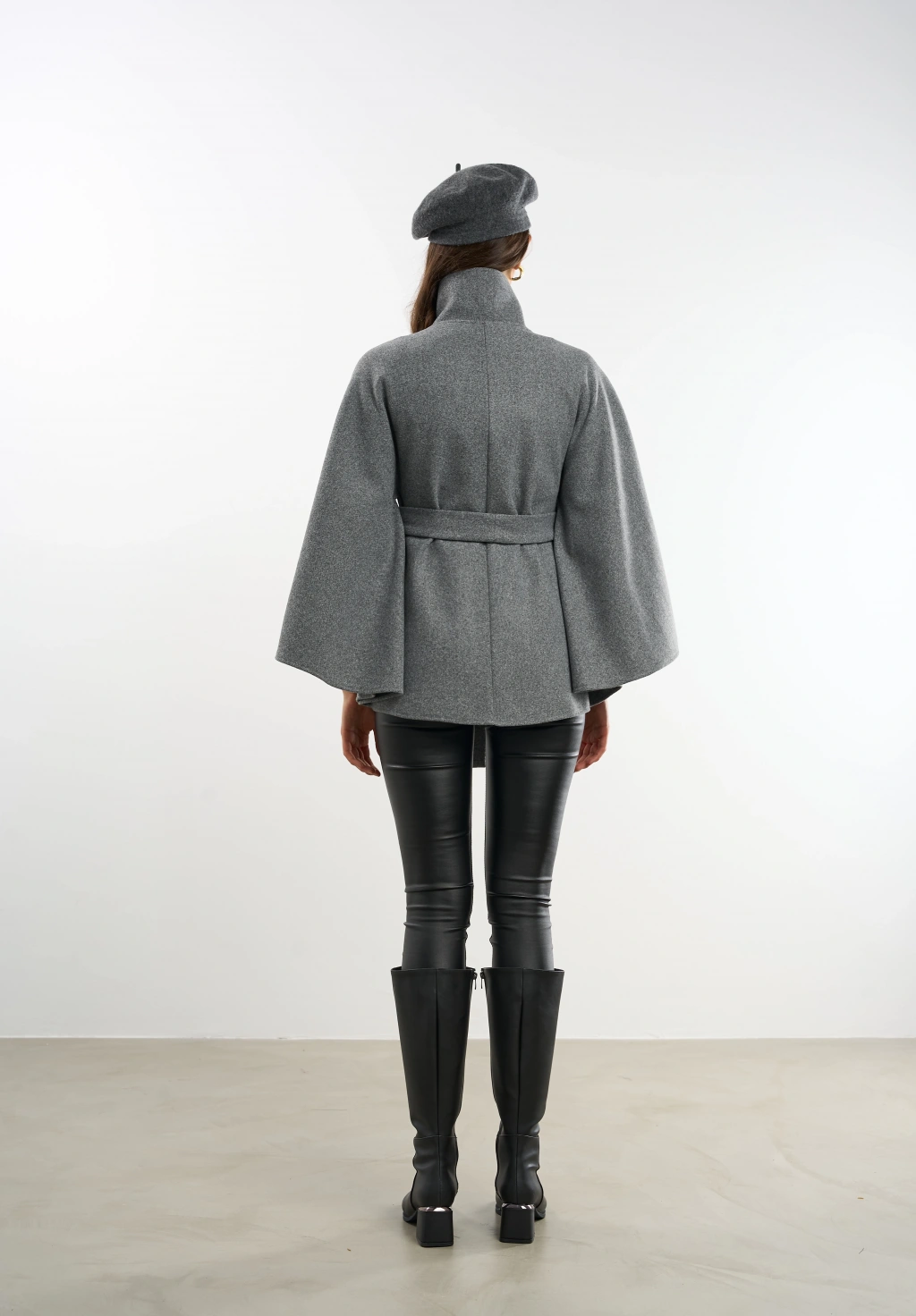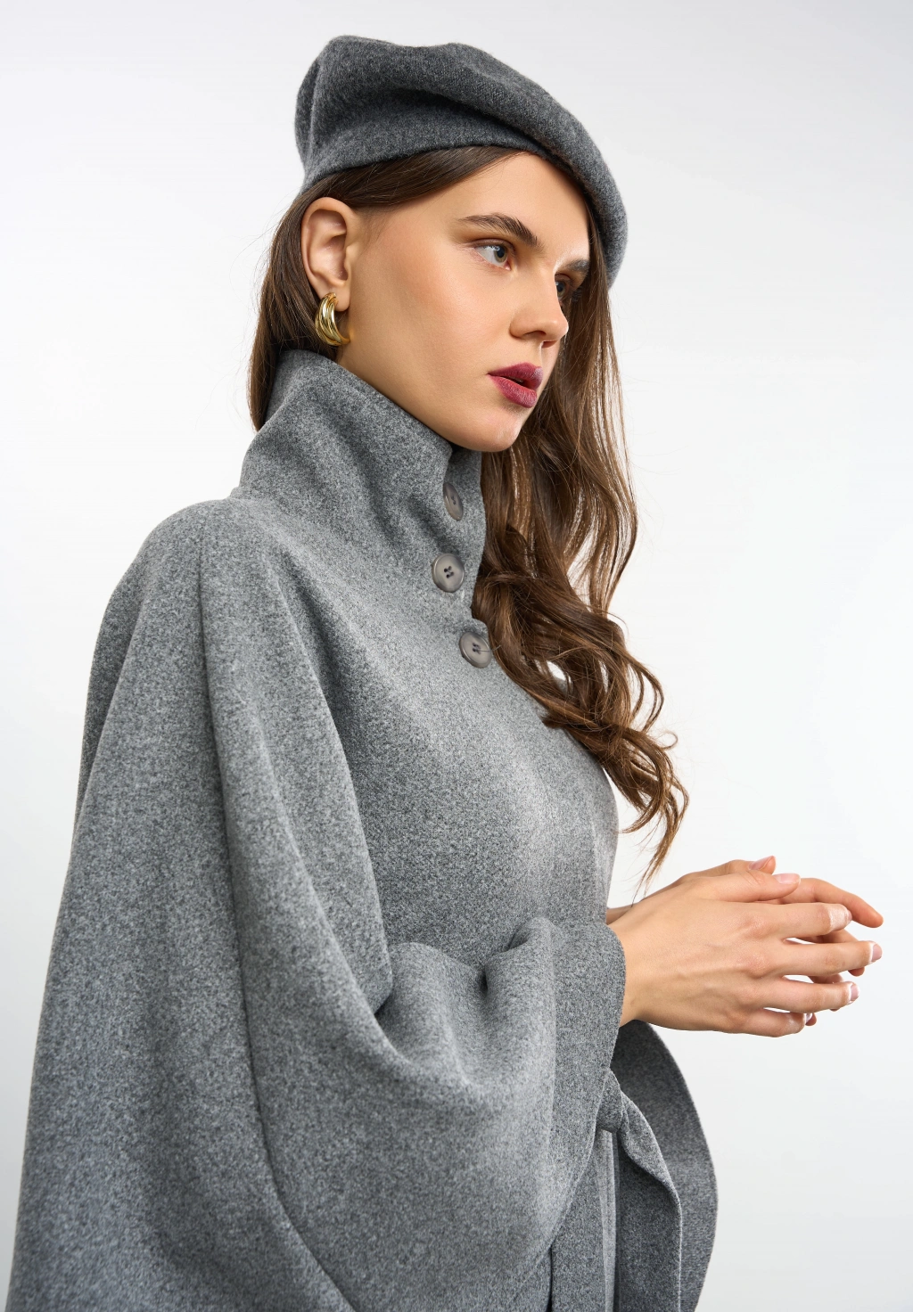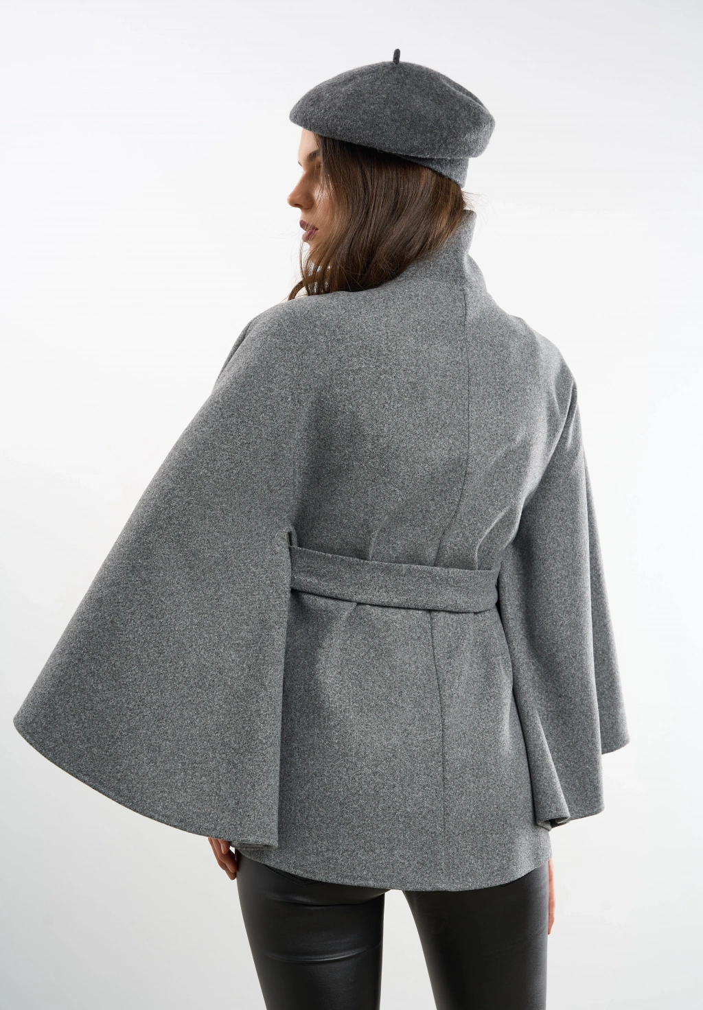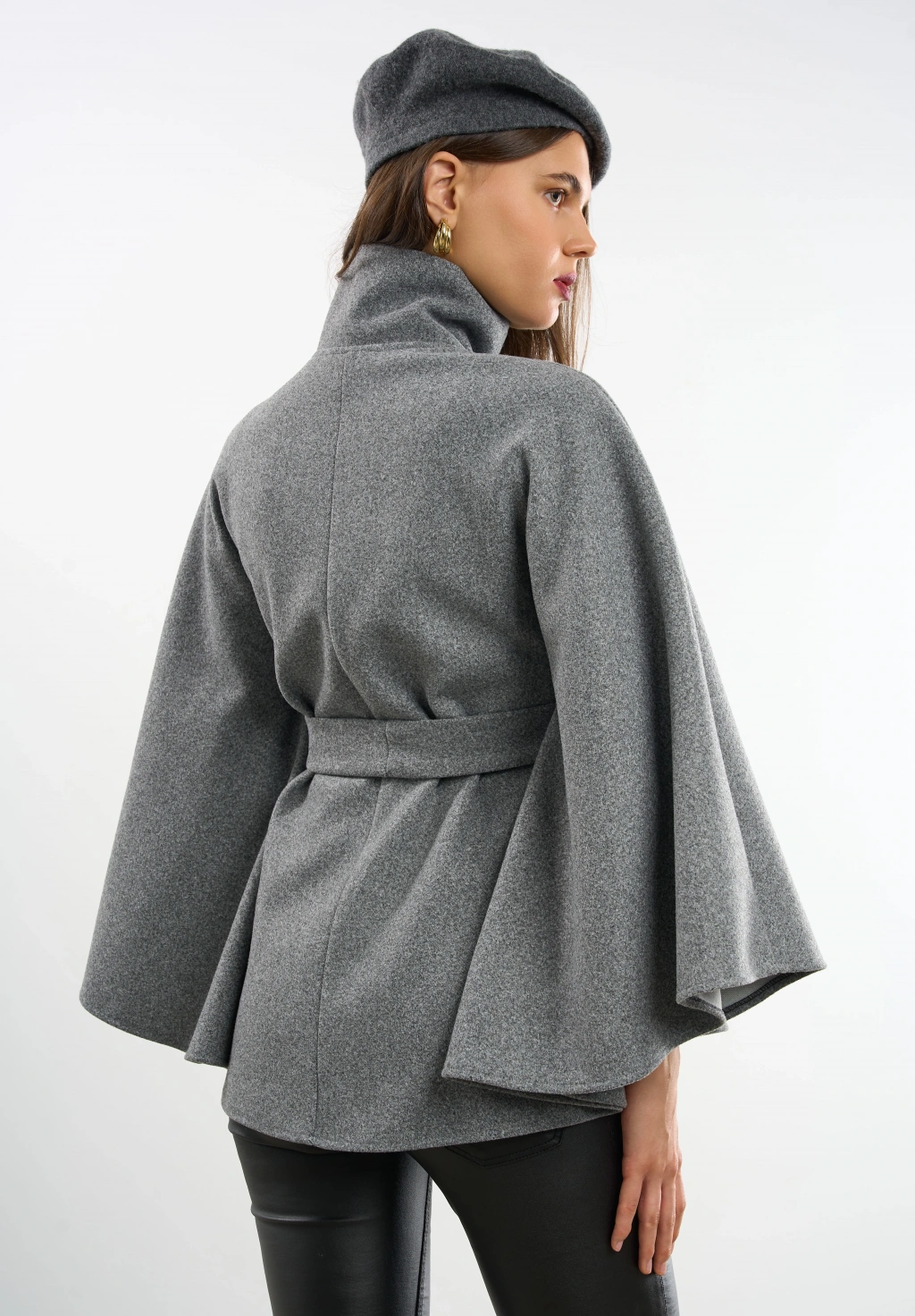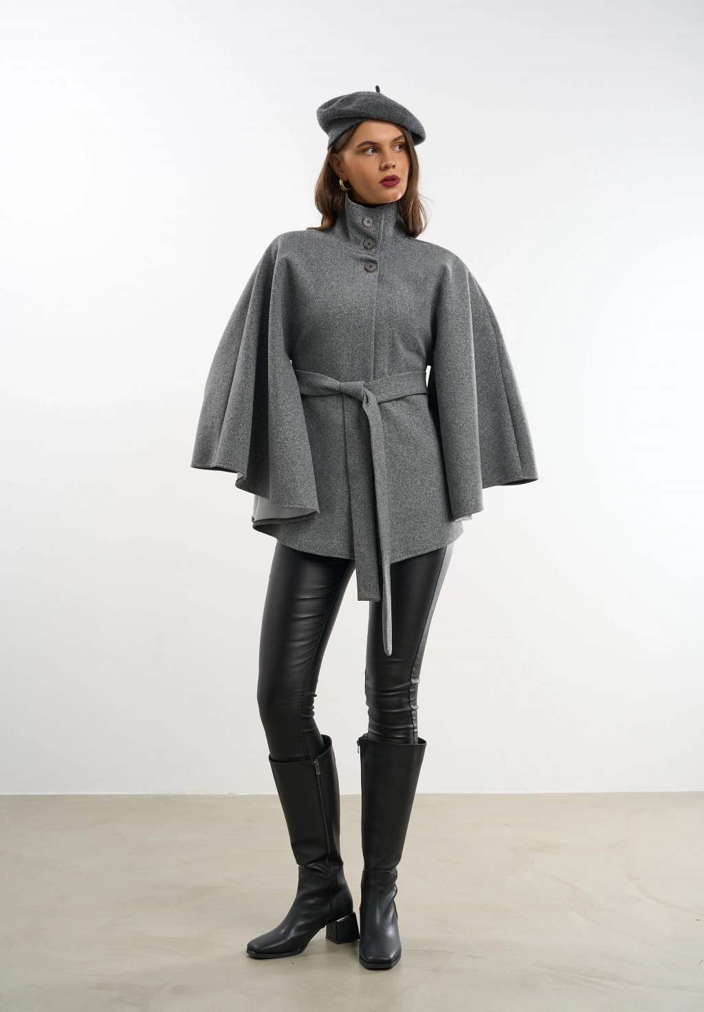 Kadın Gri Kaşe Kumaş Düğmeli Kuşaklı Pelerin Panço