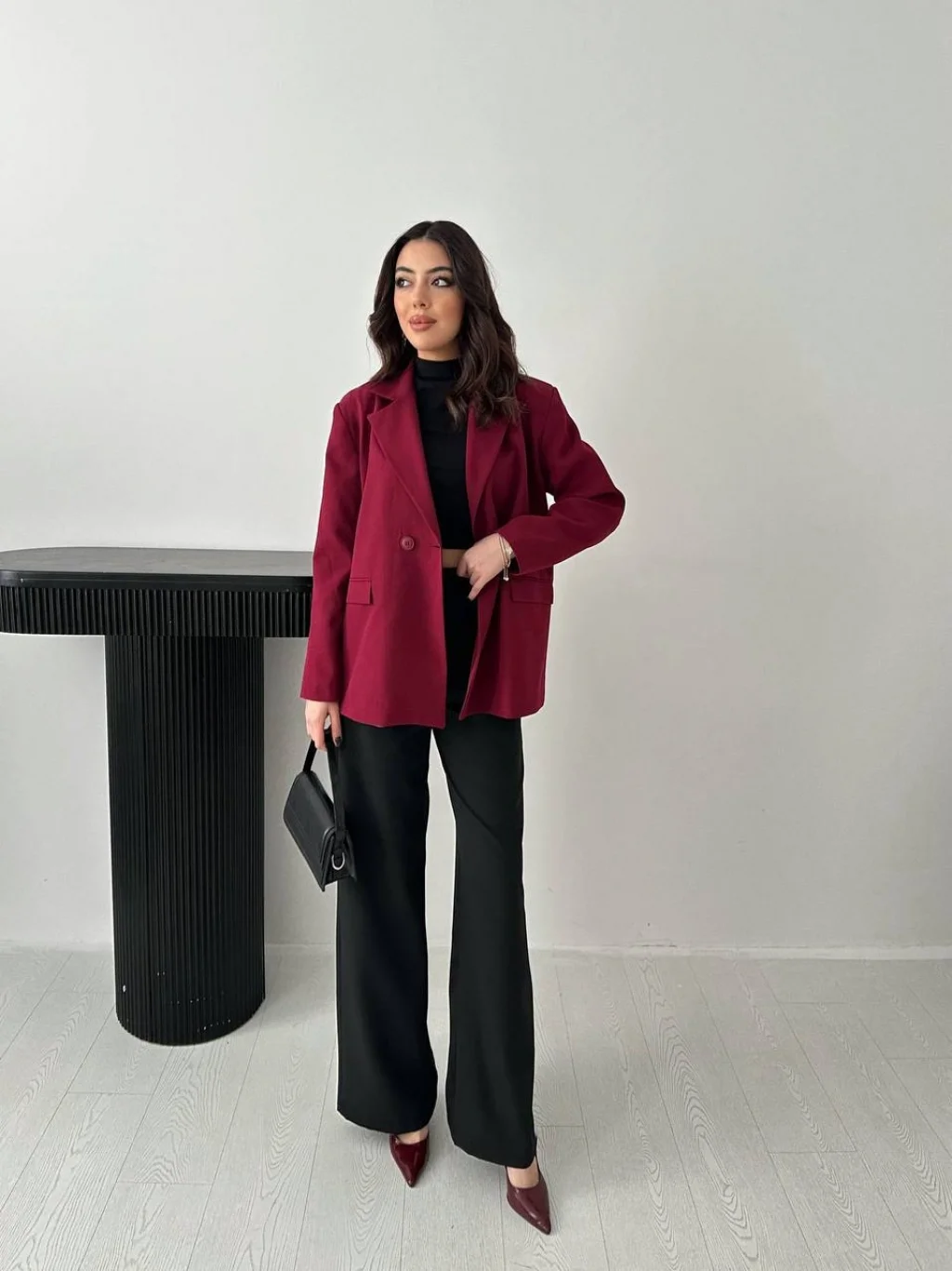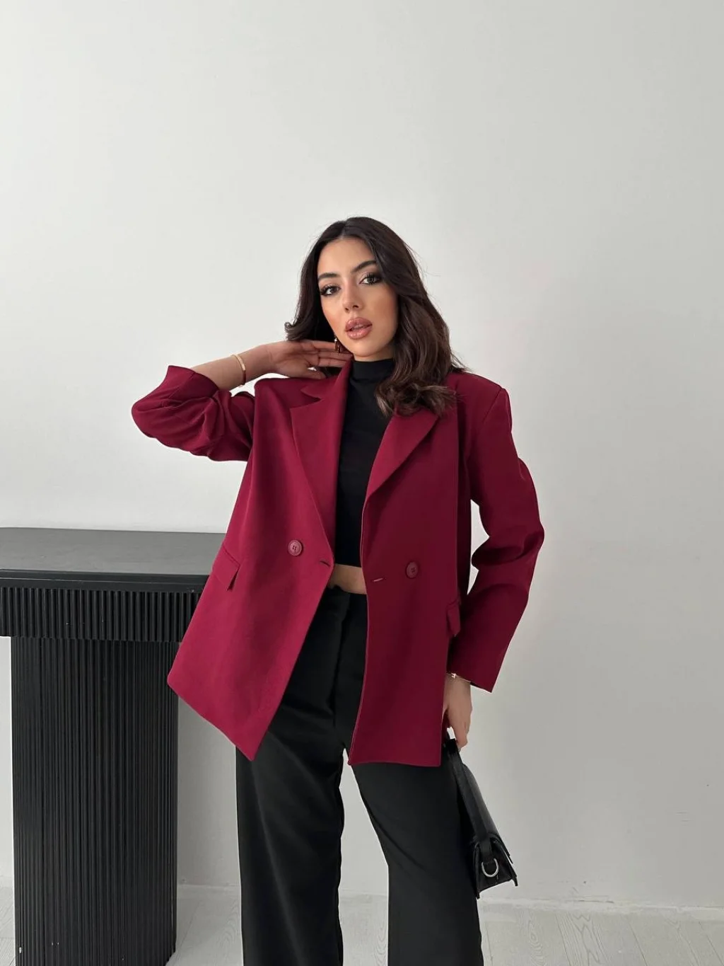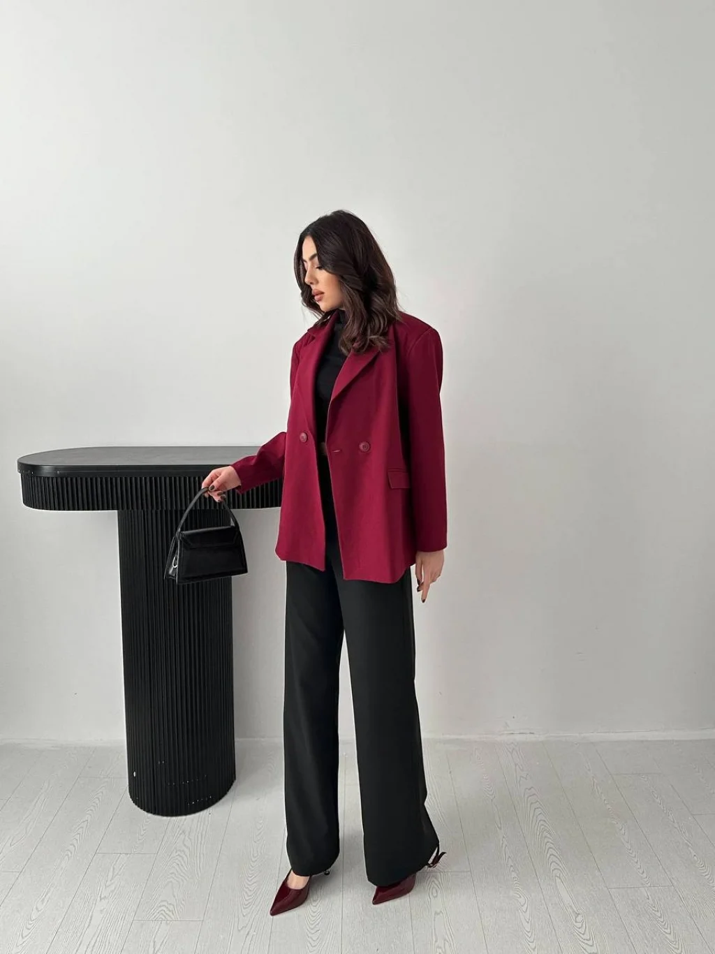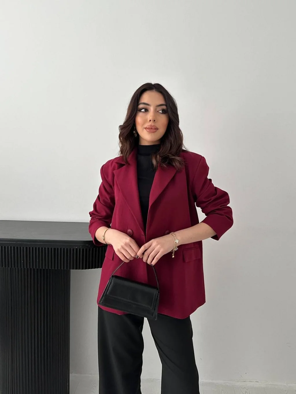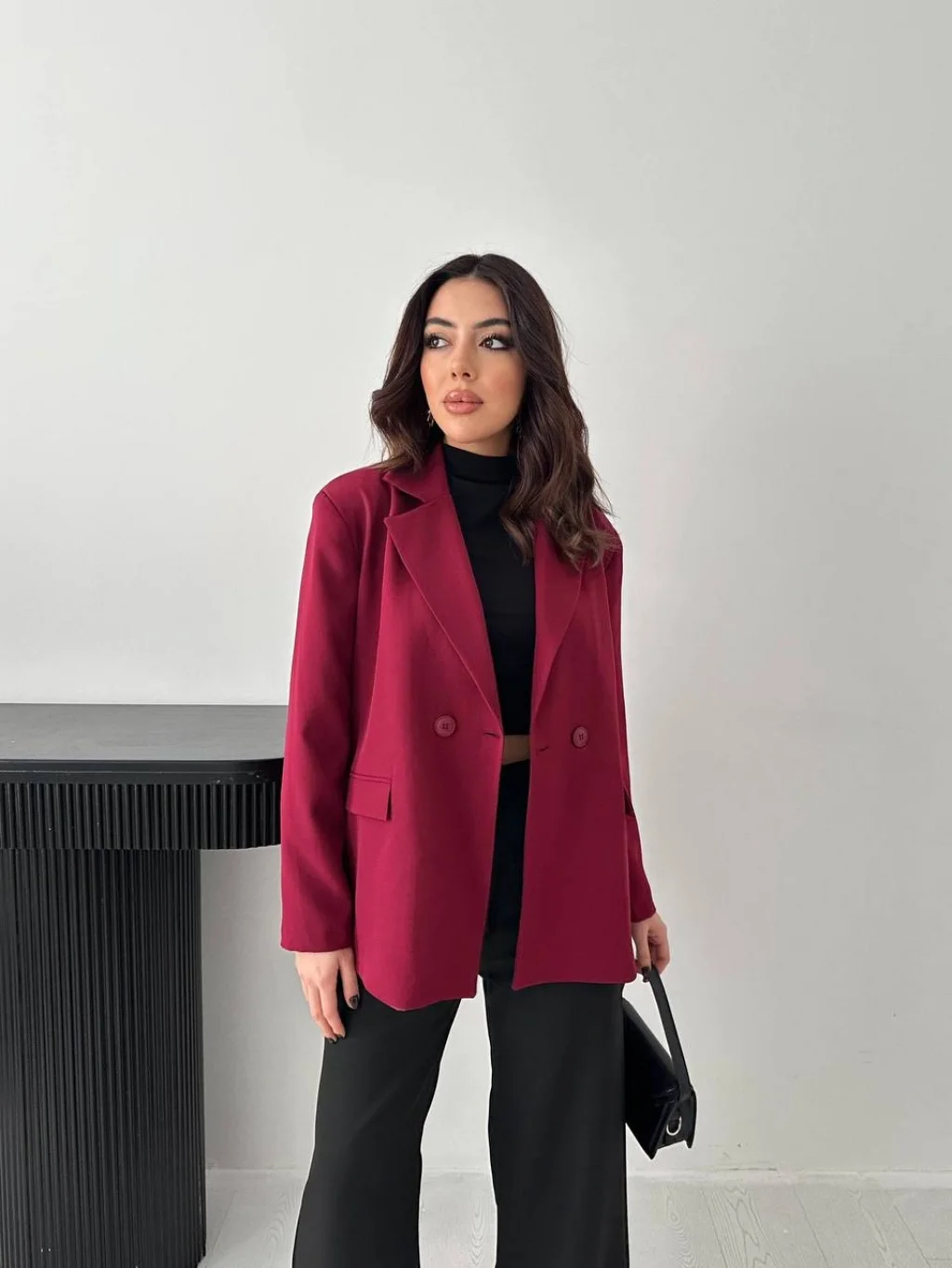 Kadın Kruvaze Oversize Mürdüm Blazer Ceket, modern çizgisi ve zarif tasarımı ile günlük kullanım ve özel günler için ideal bir tercihtir. Şık görünümü ve rahat kalıbı sayesinde stilinizi tamamlamanızı sağlar. Kaliteli kumaş yapısı uzun süreli kullanım için uygundur.