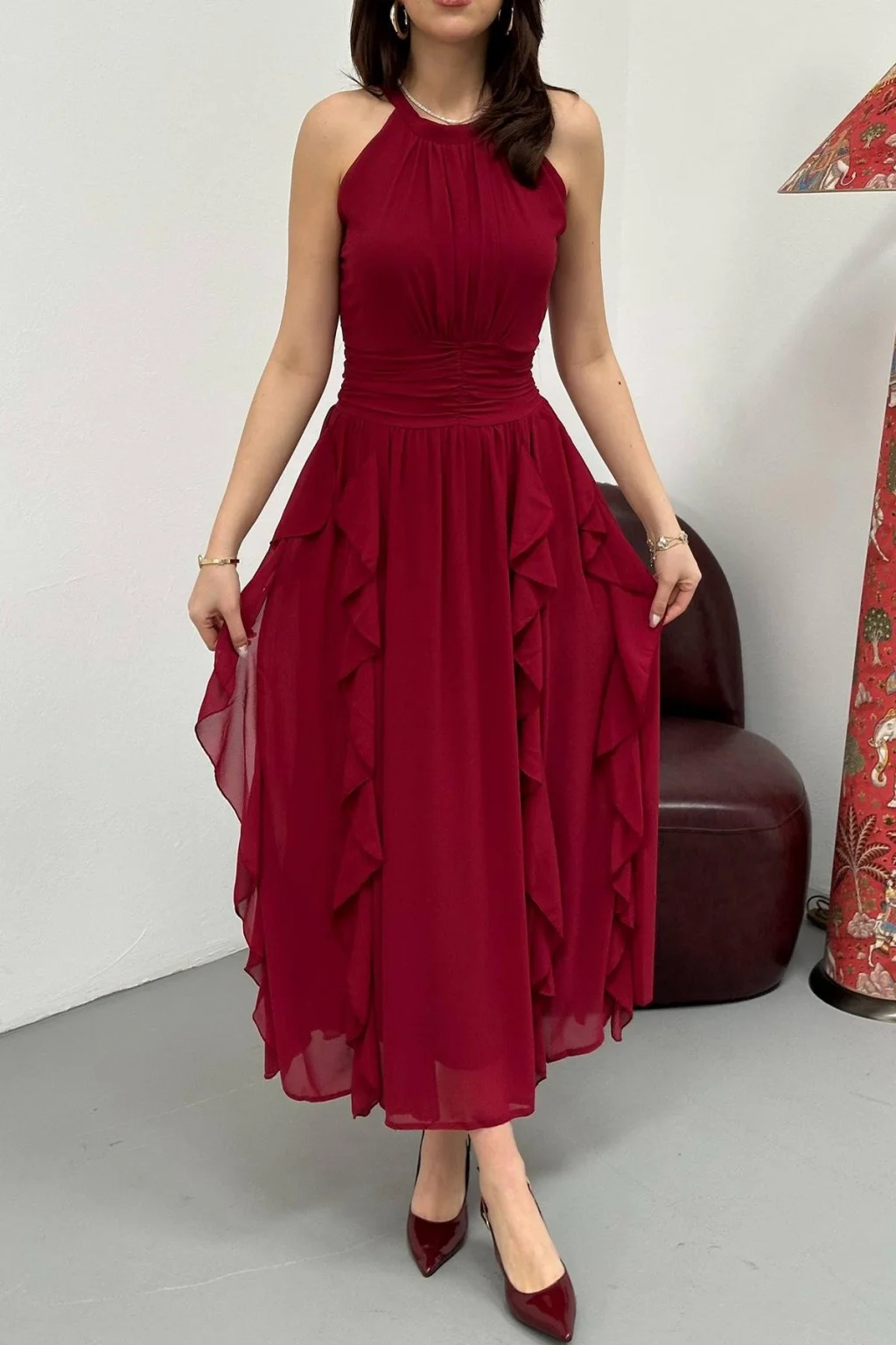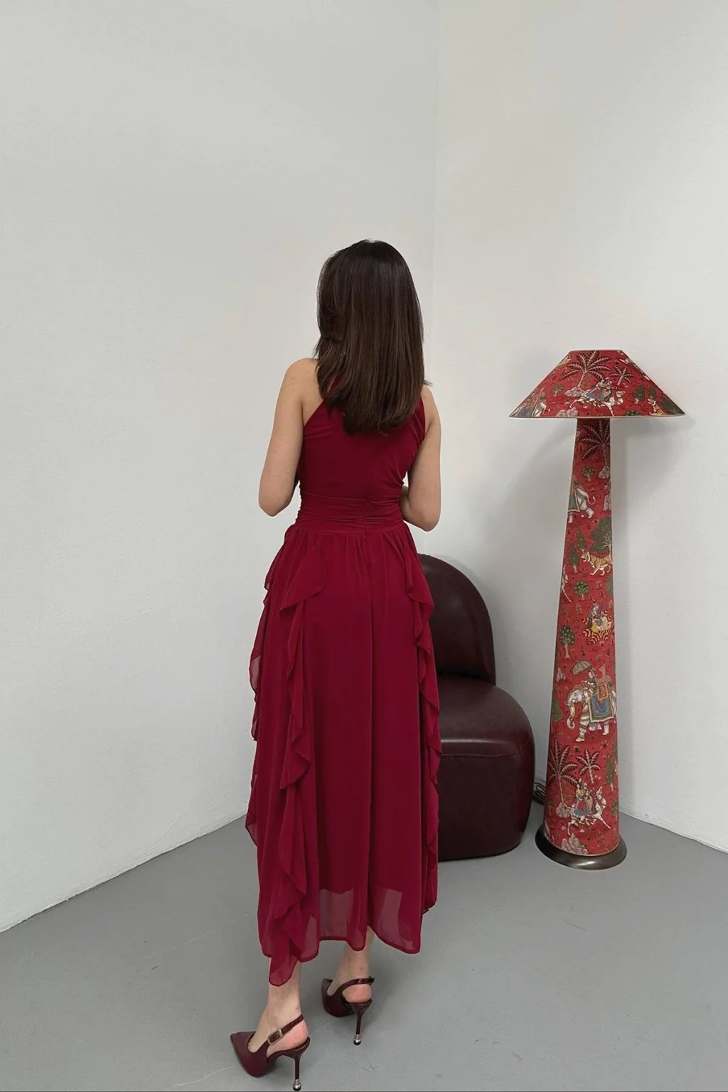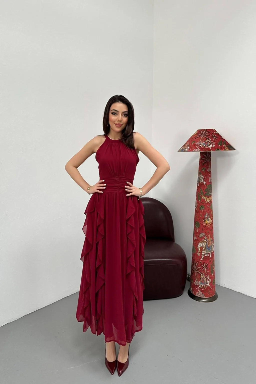 Kadın Önü Büzgülü Fırfırlı Bordo Uzun Elbise
