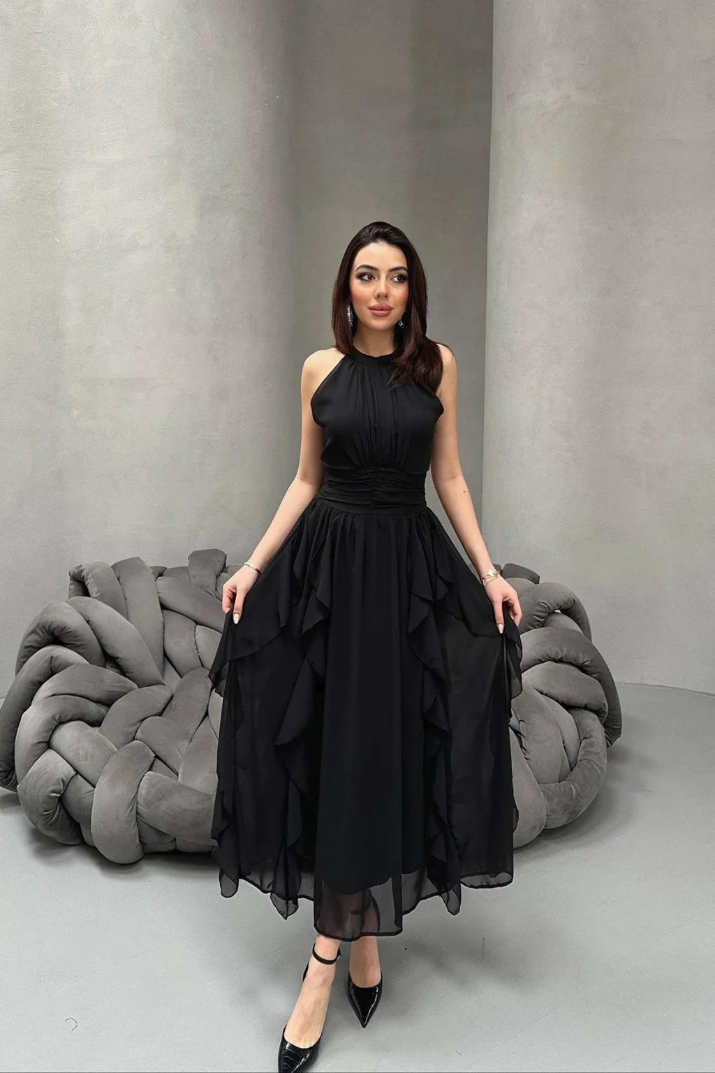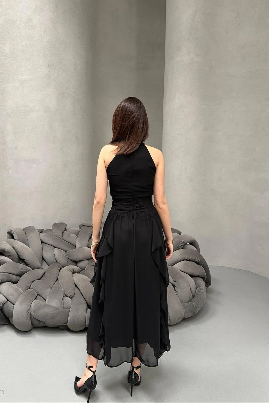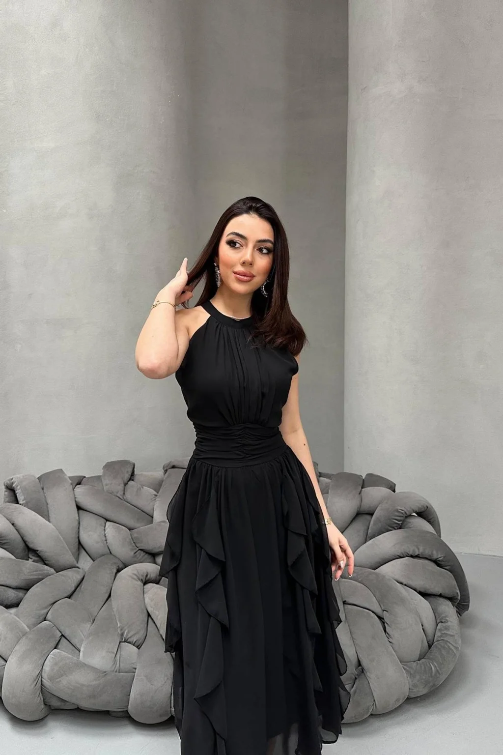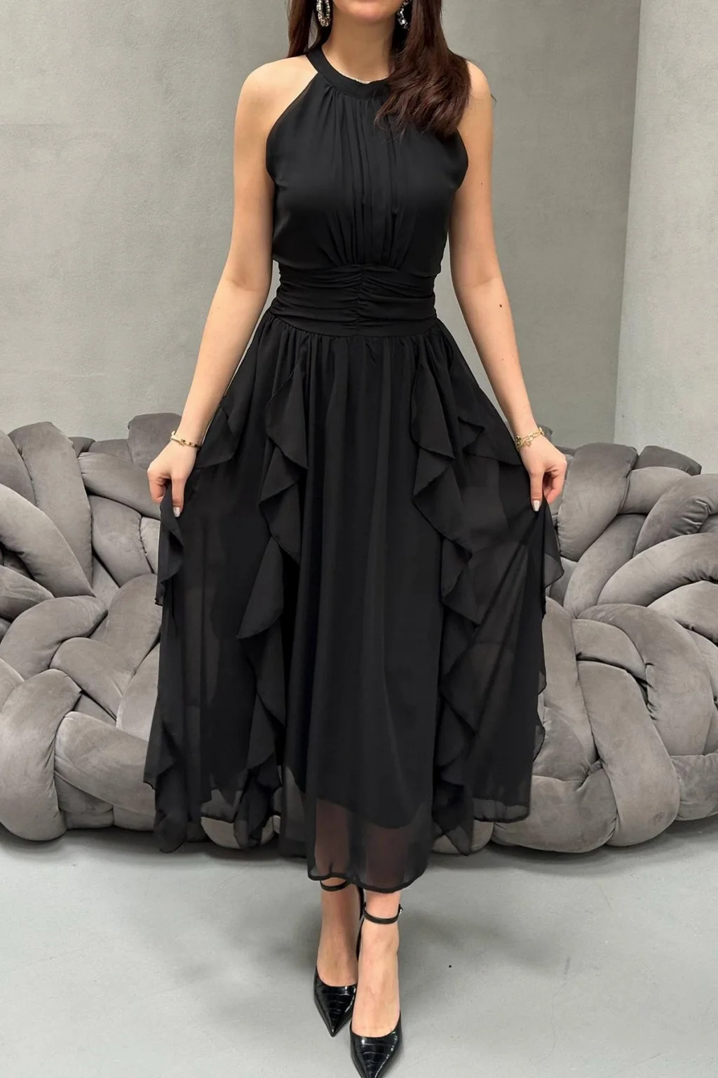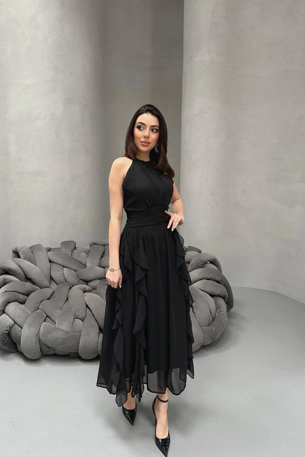 Kadın Önü Büzgülü Fırfırlı Siyah Uzun Elbise