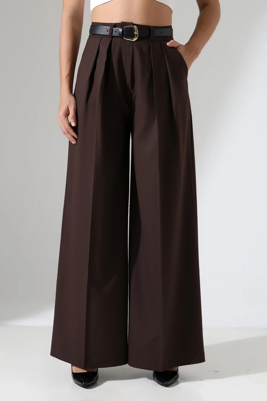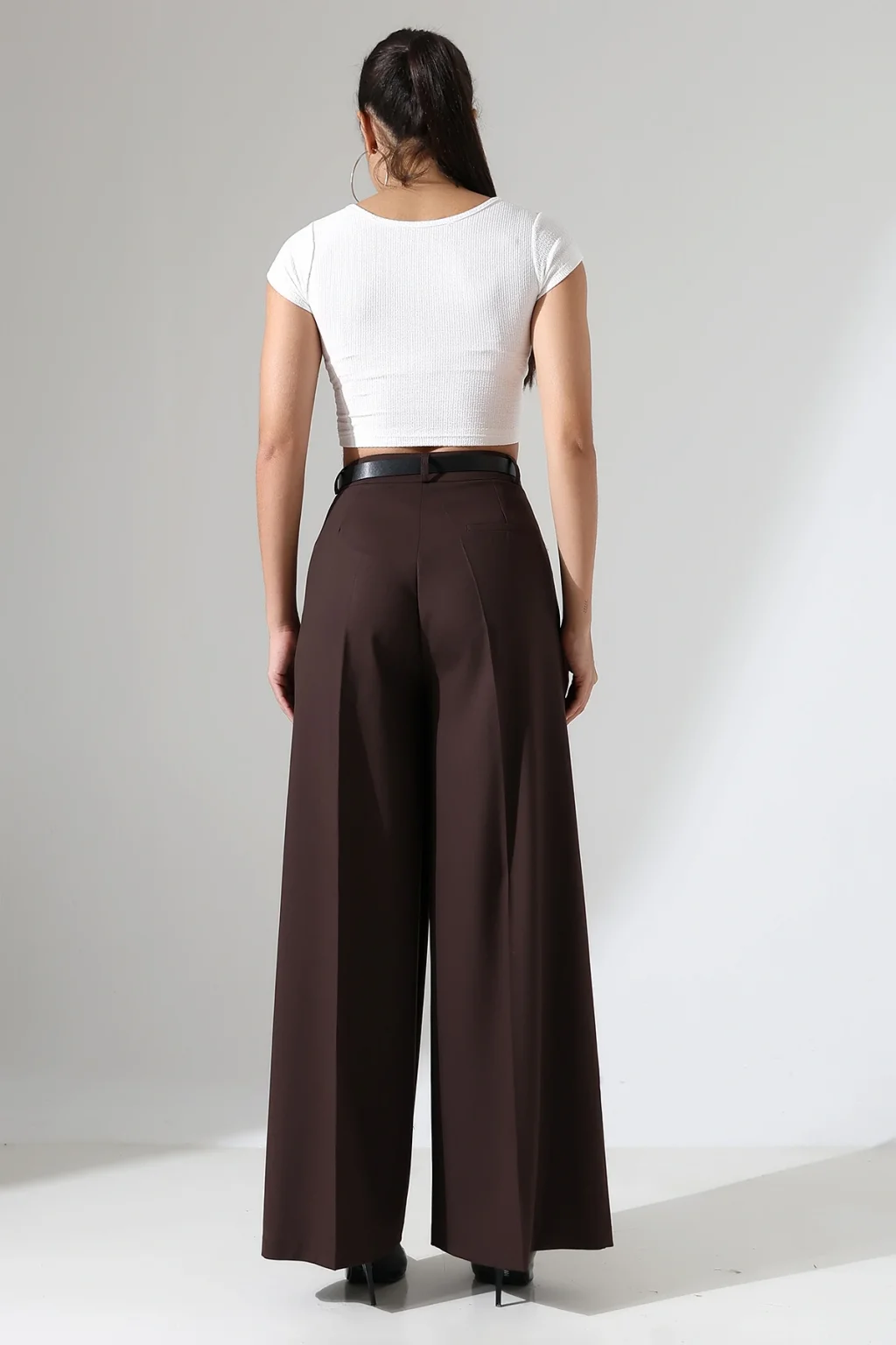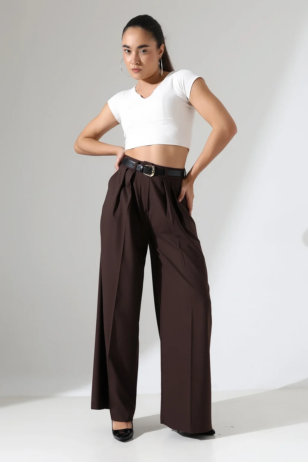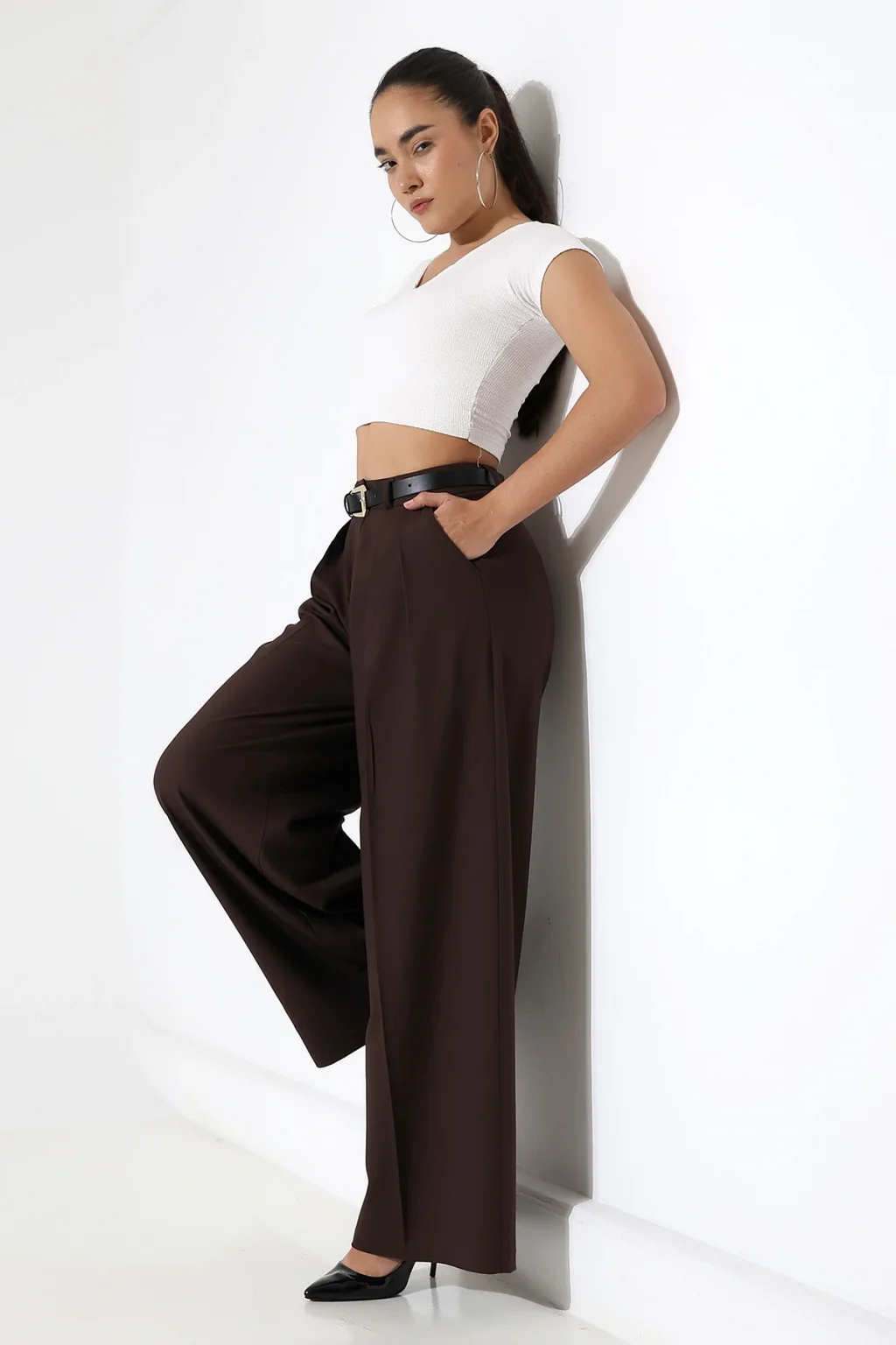 Kadın Pileli Kemerli Kahve Palazzo Pantolon