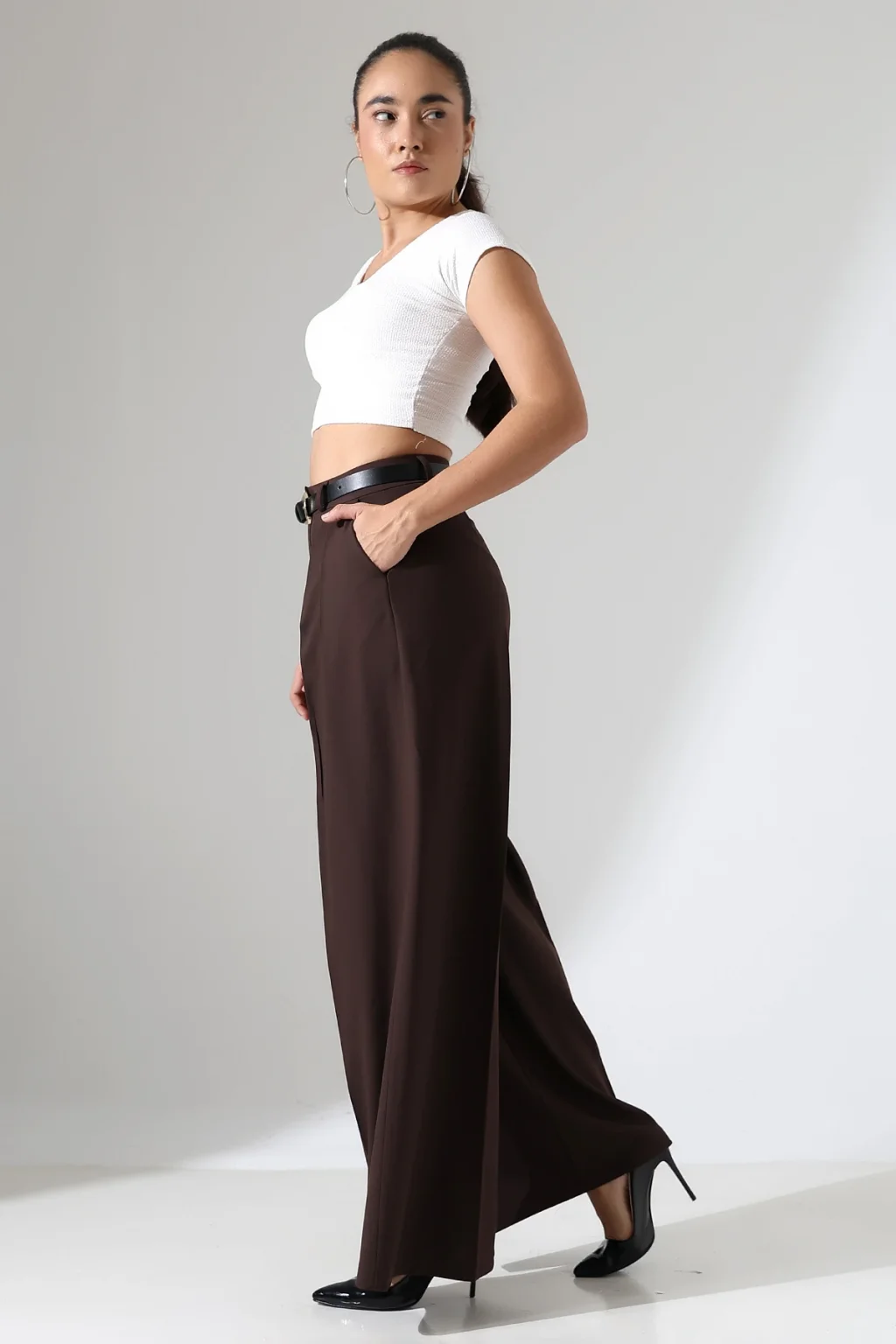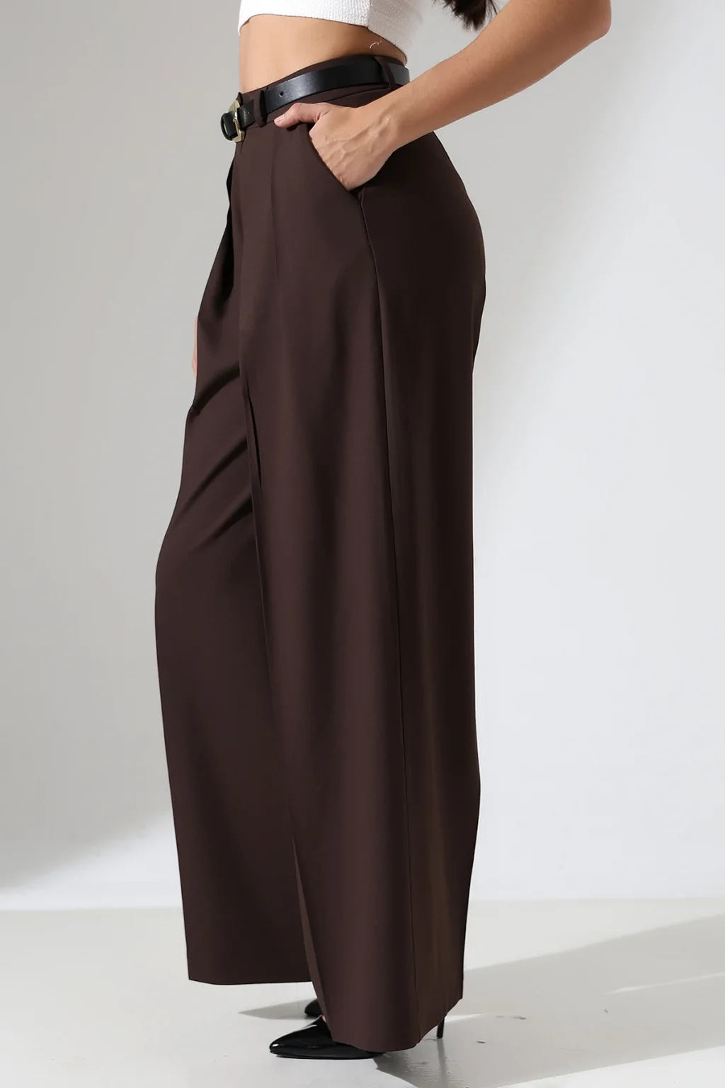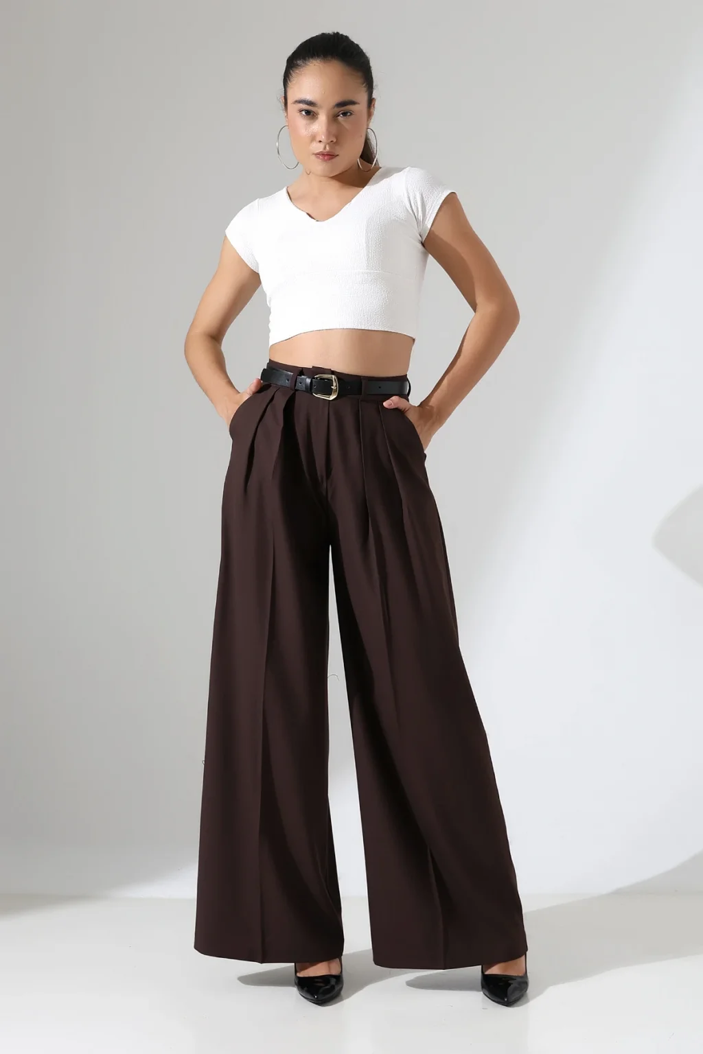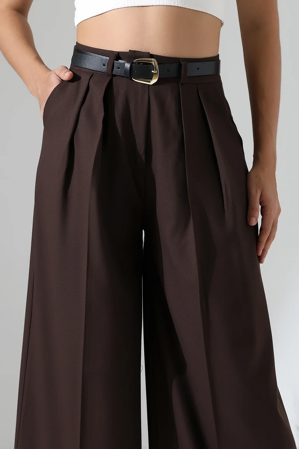 Kadın Pileli Kemerli Kahve Palazzo Pantolon