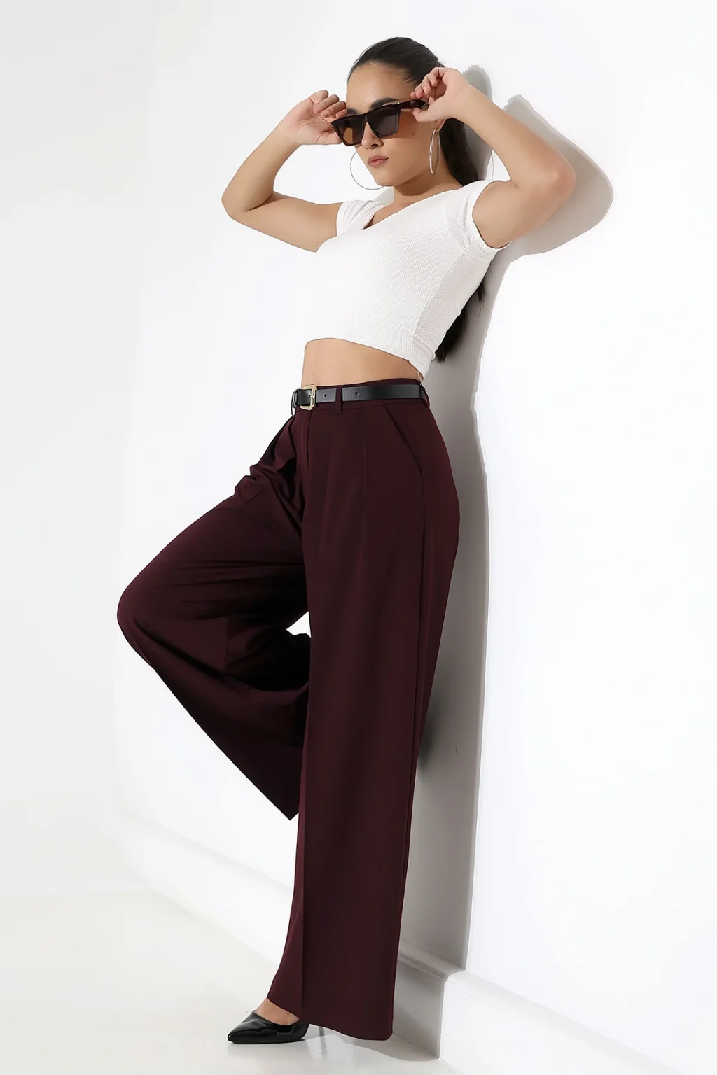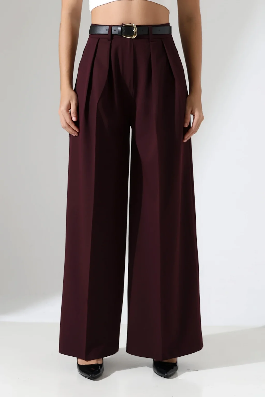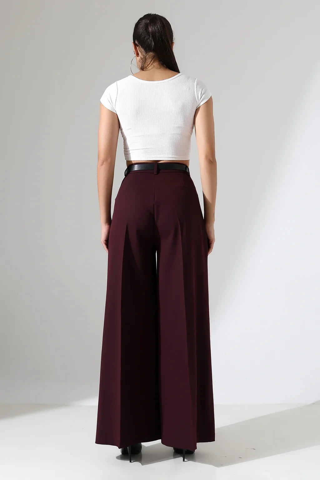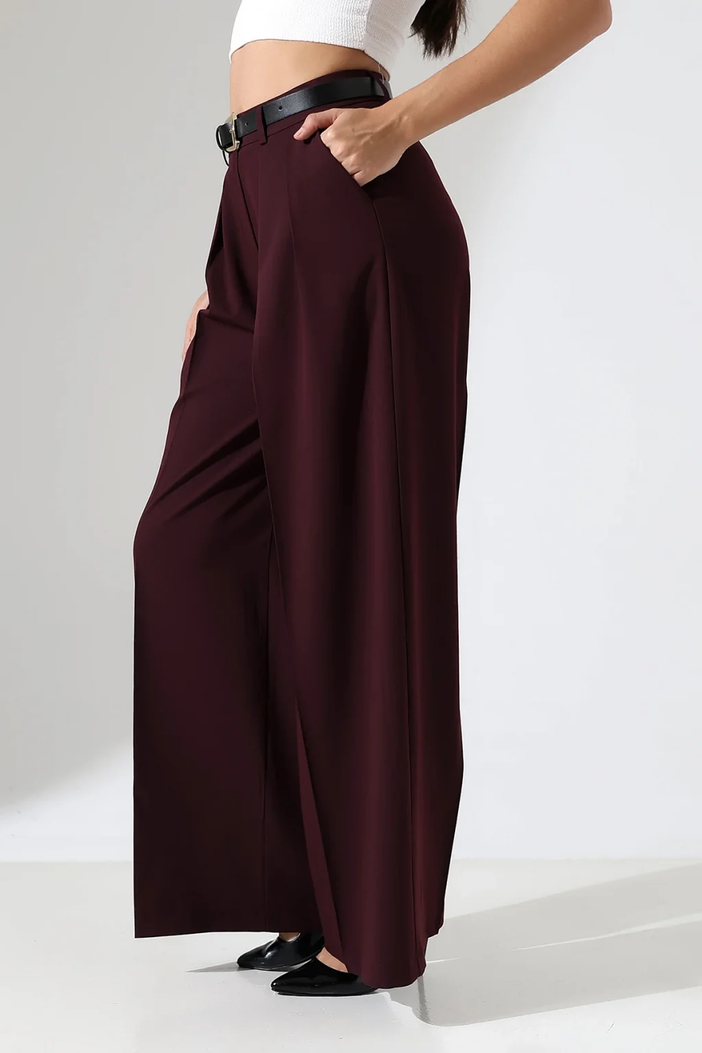 Kadın Pileli Kemerli Mürdüm Palazzo Pantolon