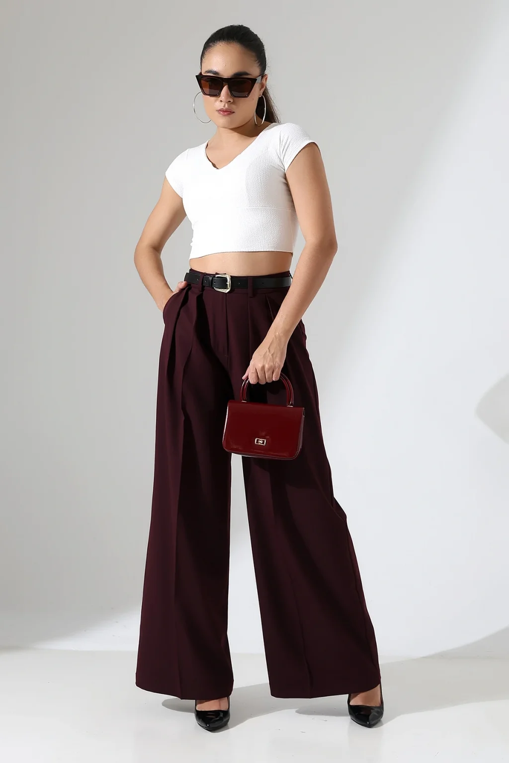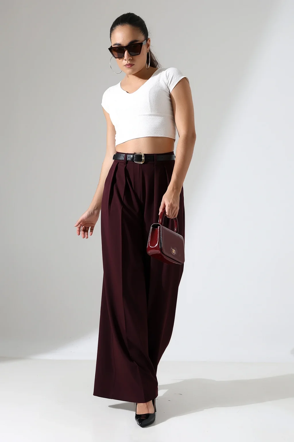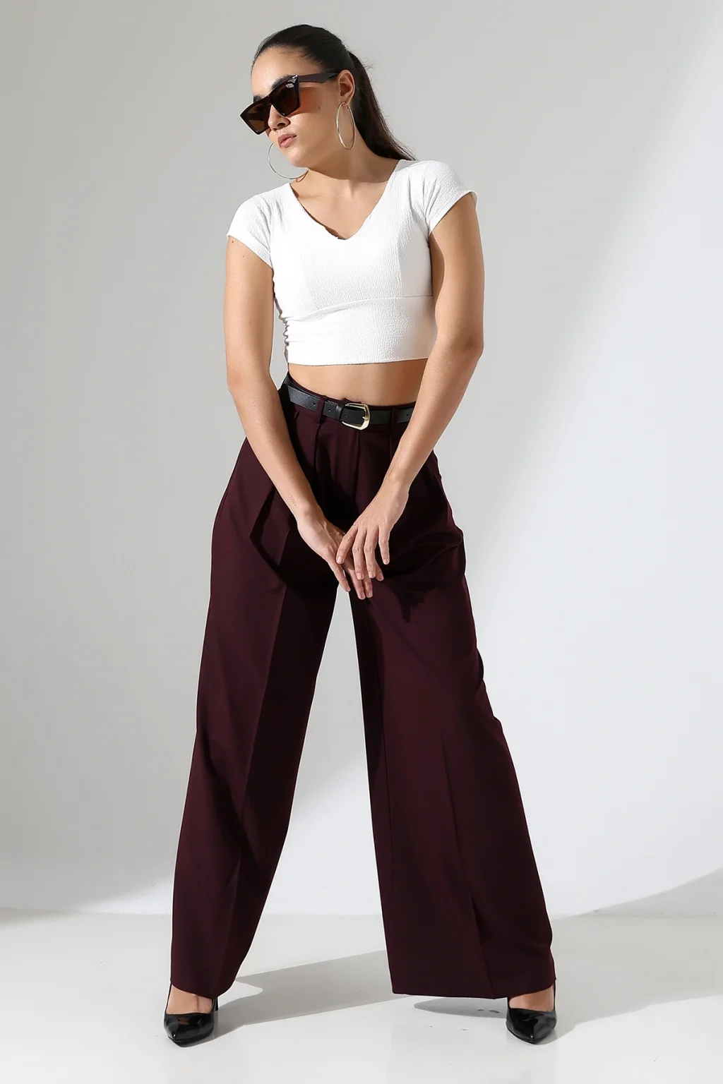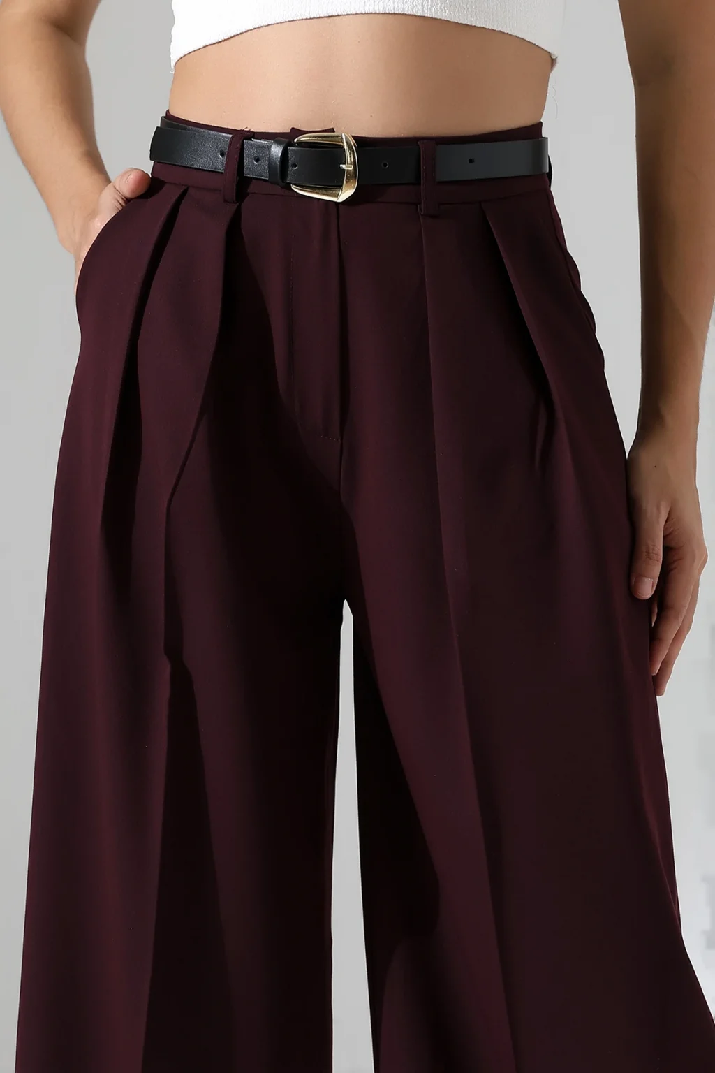 Kadın Pileli Kemerli Mürdüm Palazzo Pantolon