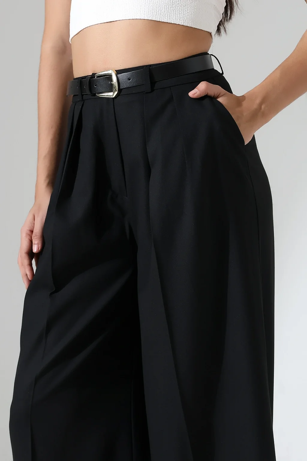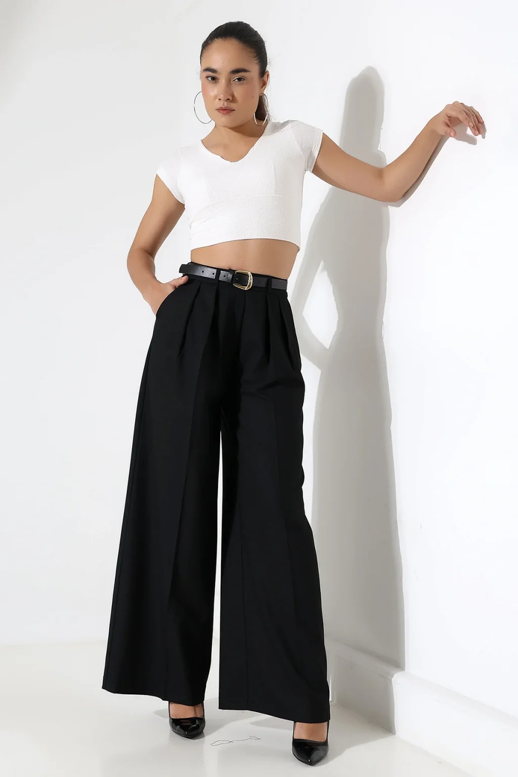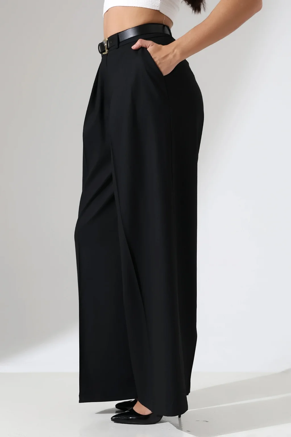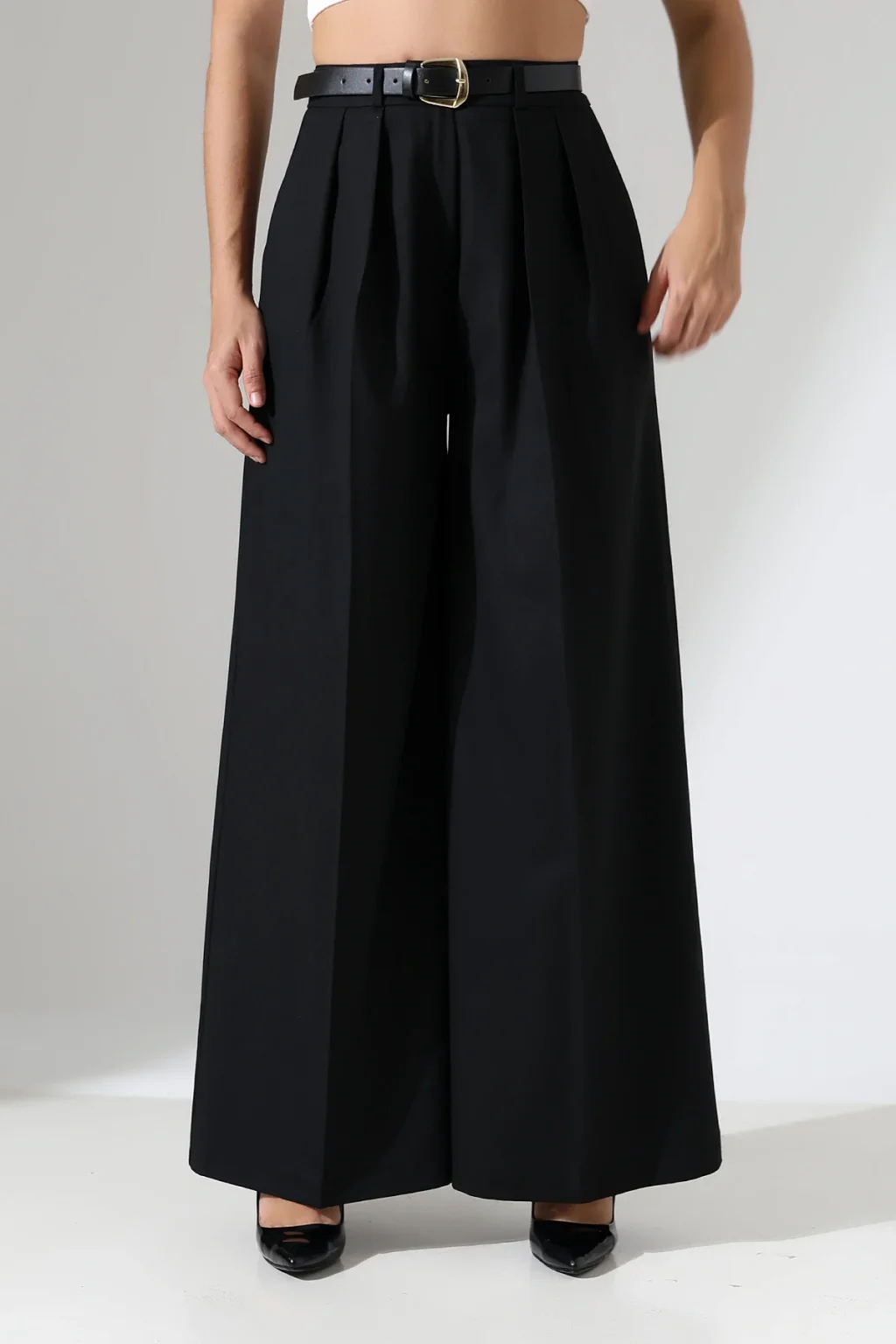 Kadın Pileli Kemerli Siyah Palazzo Pantolon