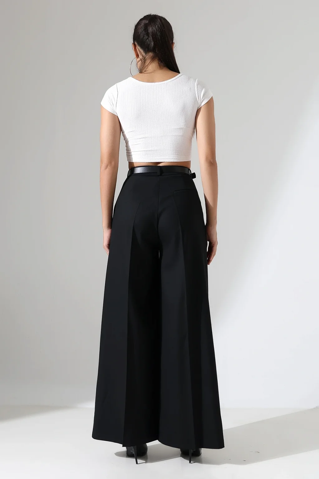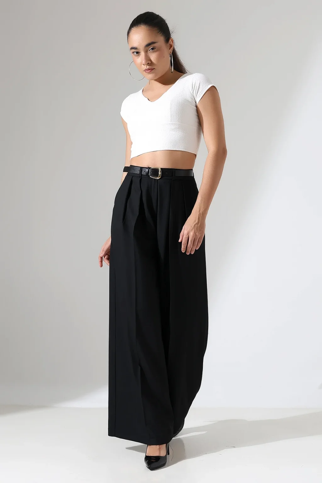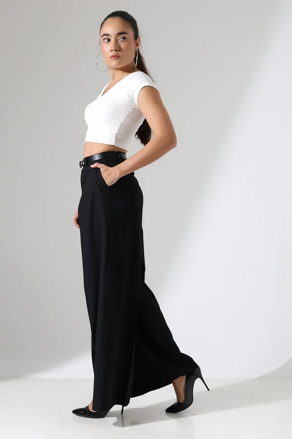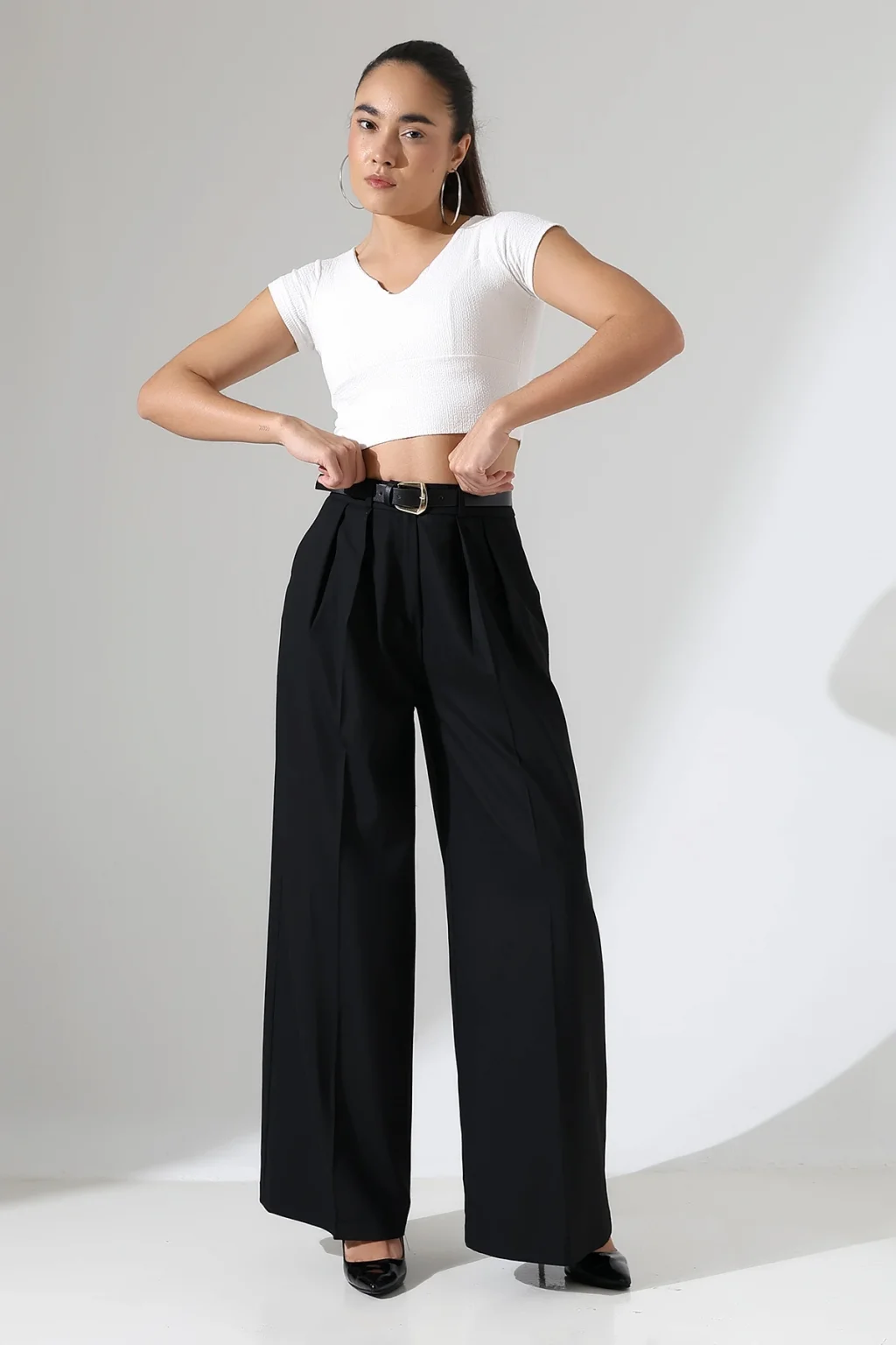 Kadın Pileli Kemerli Siyah Palazzo Pantolon