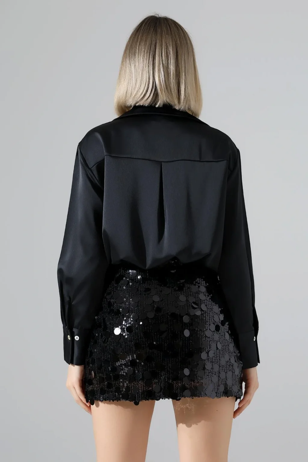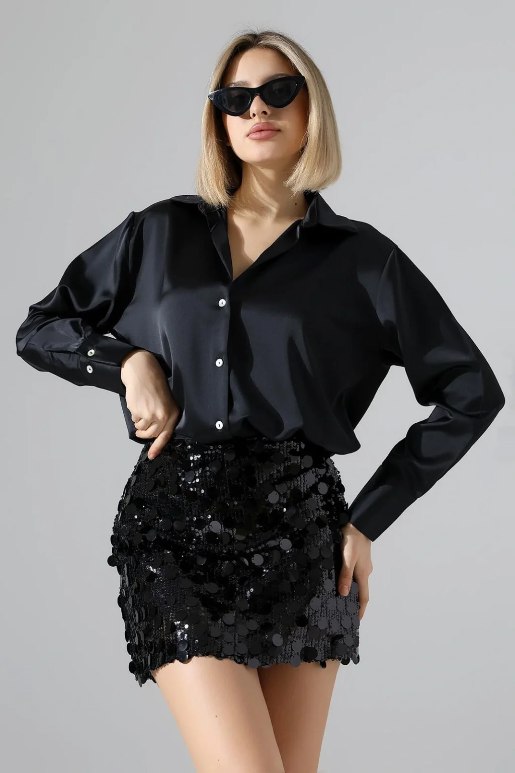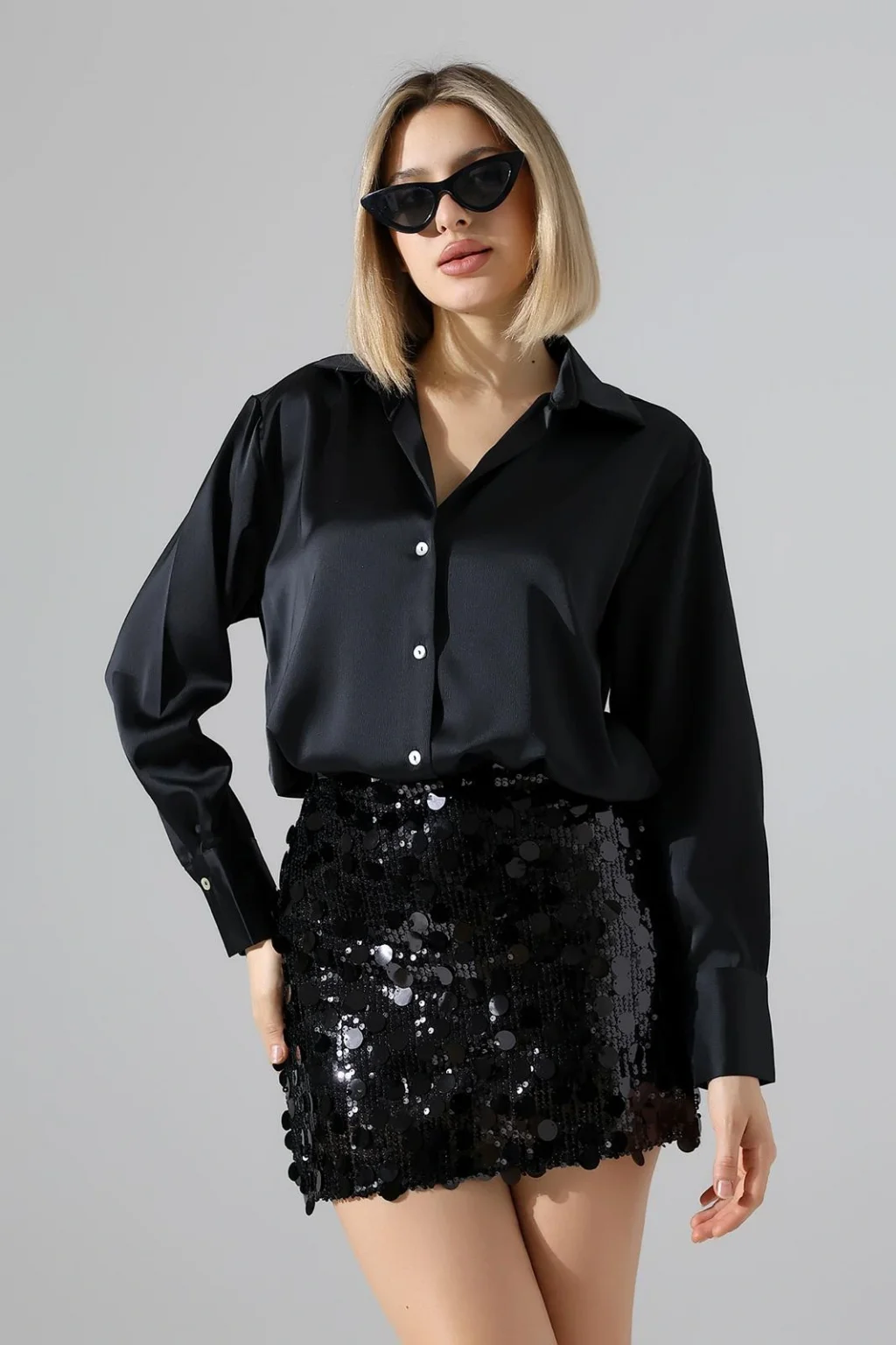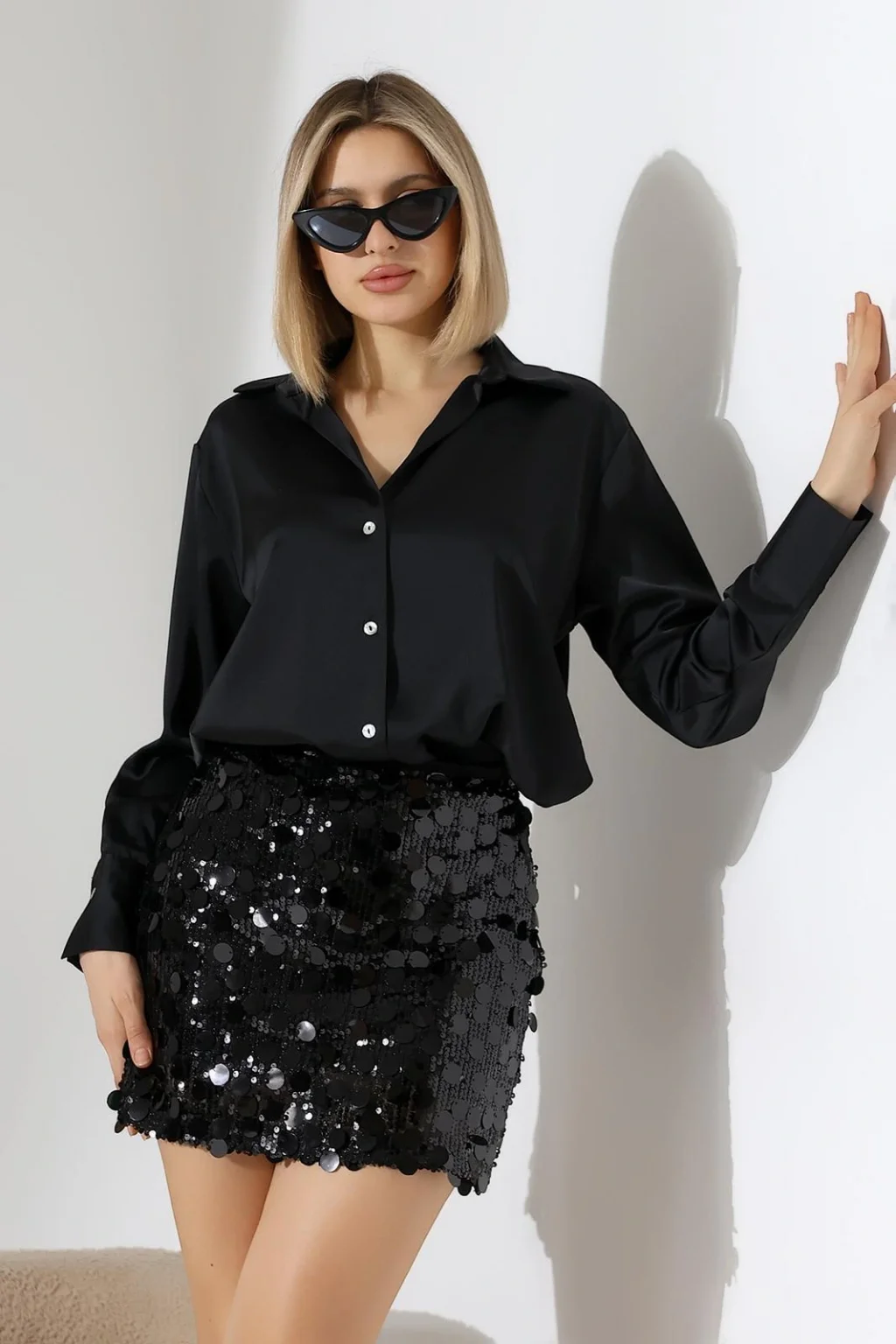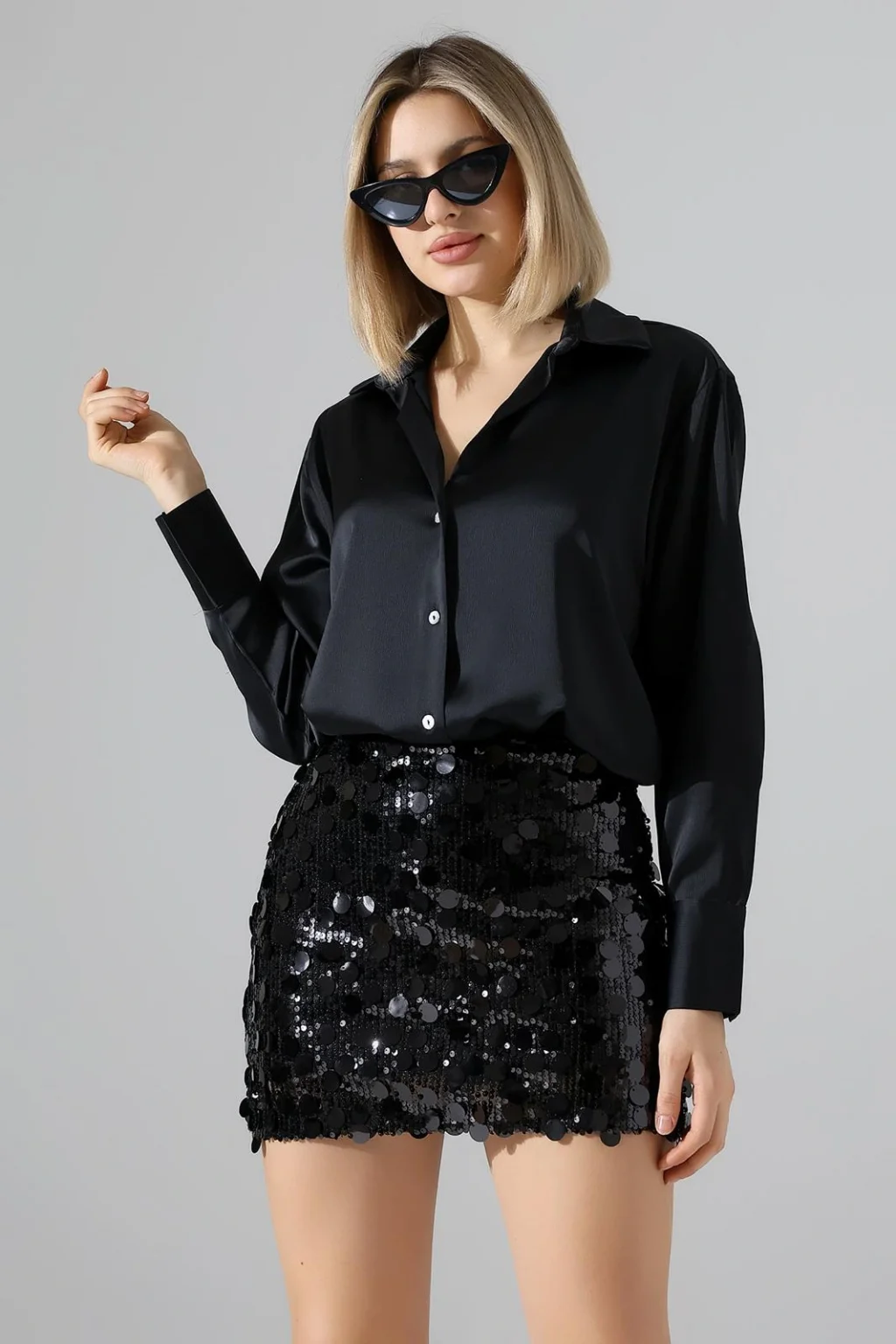 Kadın Pul Payet Şortlu Siyah Mini Etek