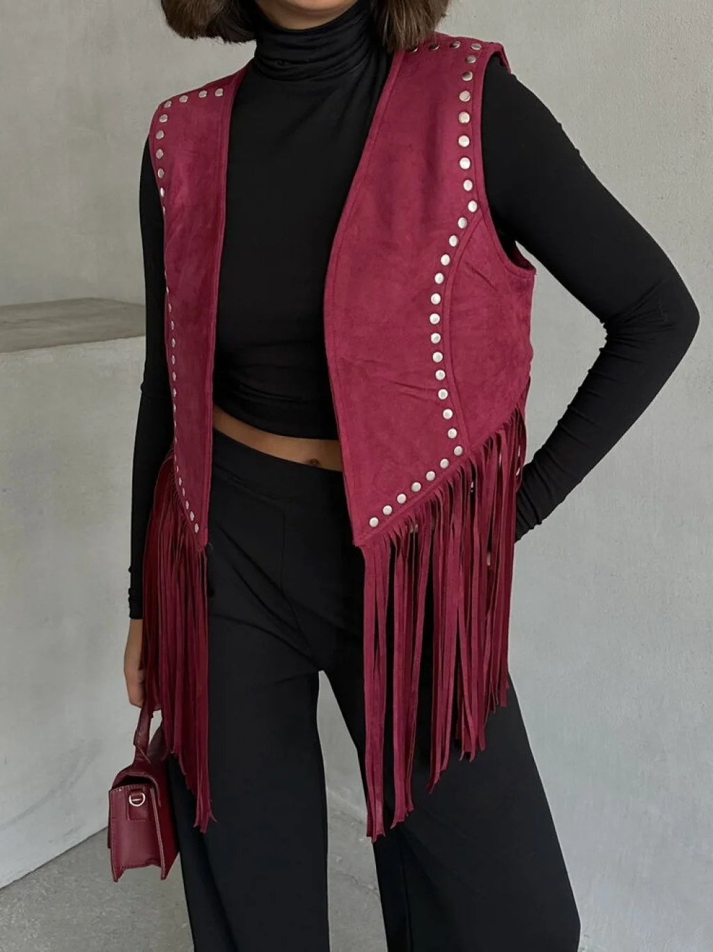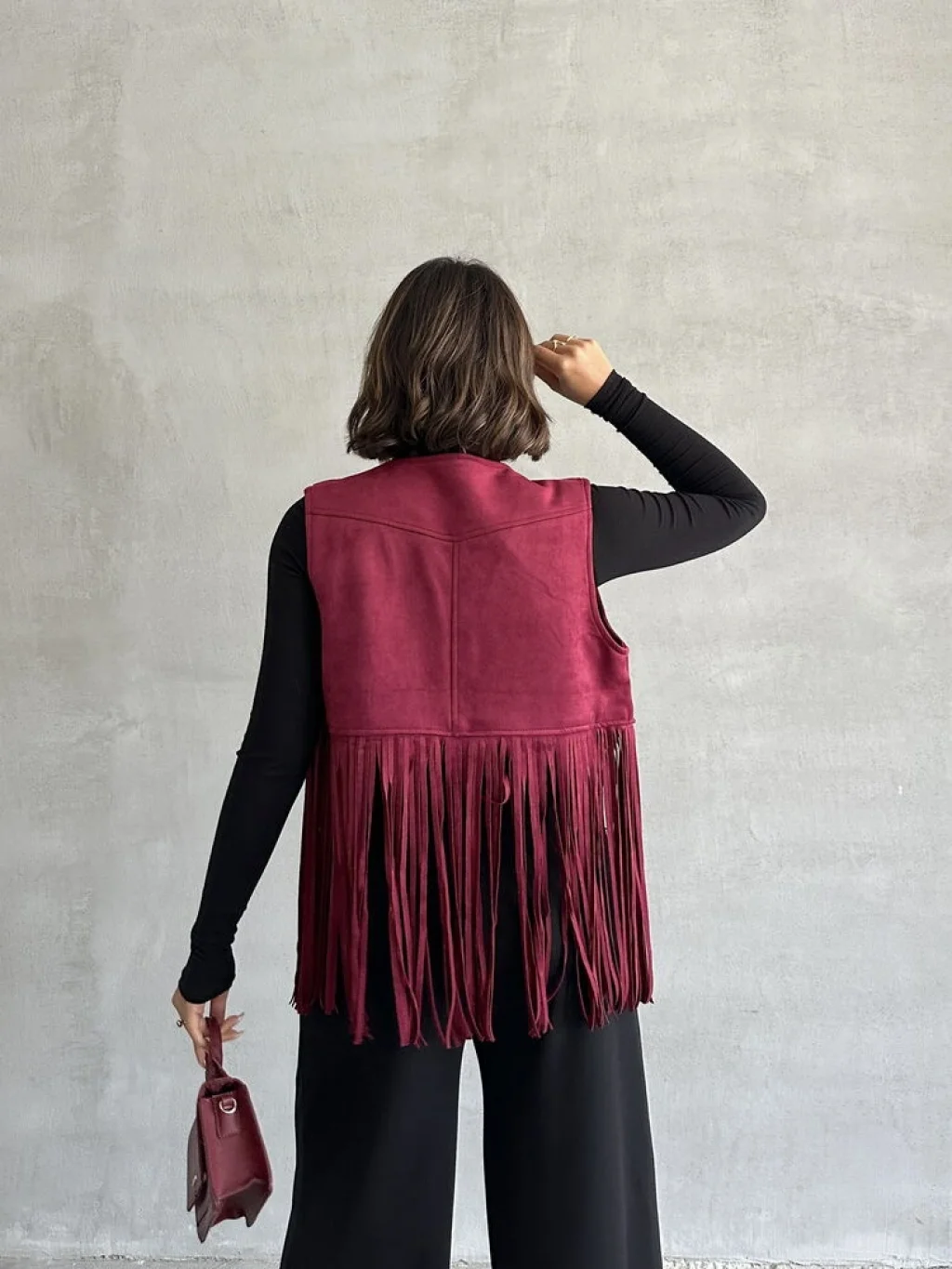 Kadın Püsküllü Bordo Süet Yelek