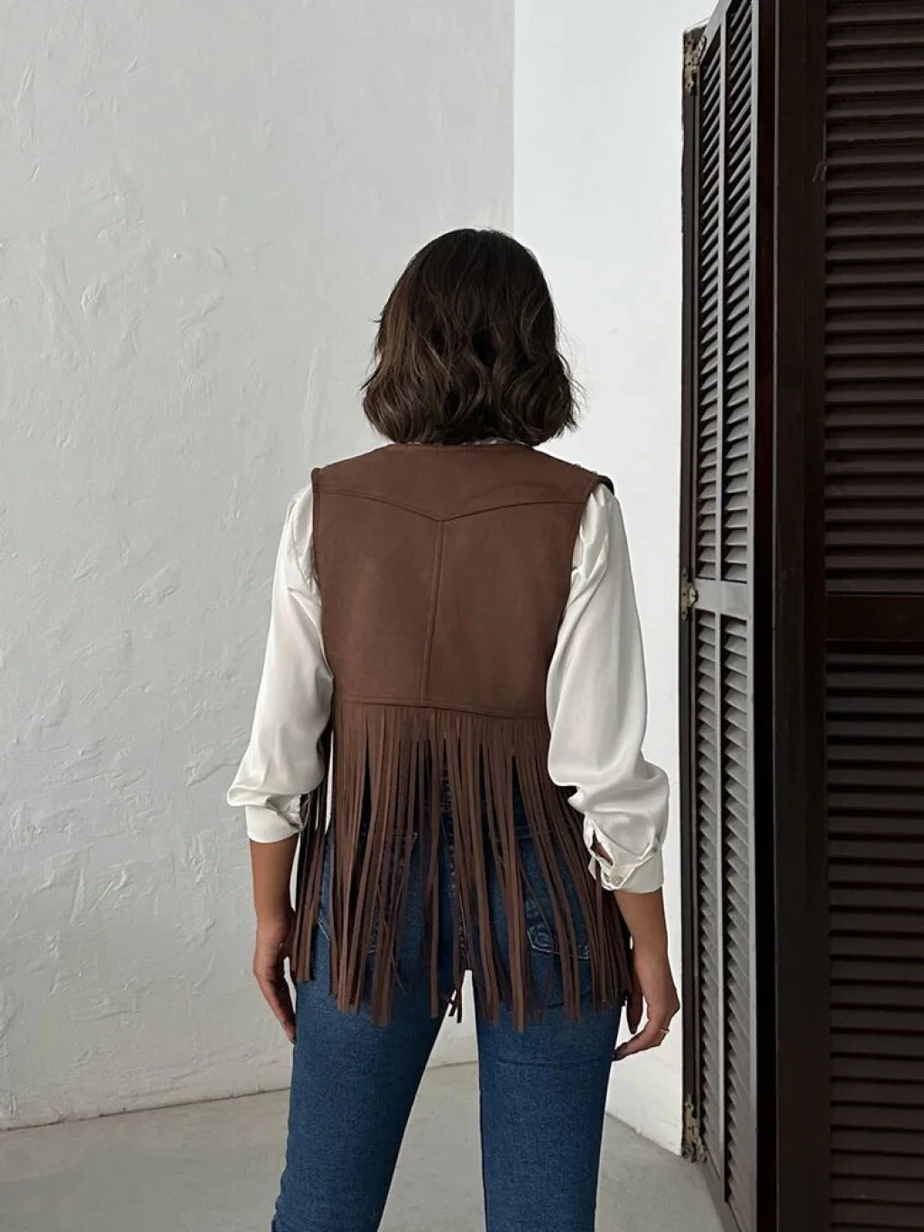 Kadın Püsküllü Kahverengi Süet Yelek, modern çizgisi ve zarif tasarımı ile günlük kullanım ve özel günler için ideal bir tercihtir. Şık görünümü ve rahat kalıbı sayesinde stilinizi tamamlamanızı sağlar. Kaliteli kumaş yapısı uzun süreli kullanım için uygundur.