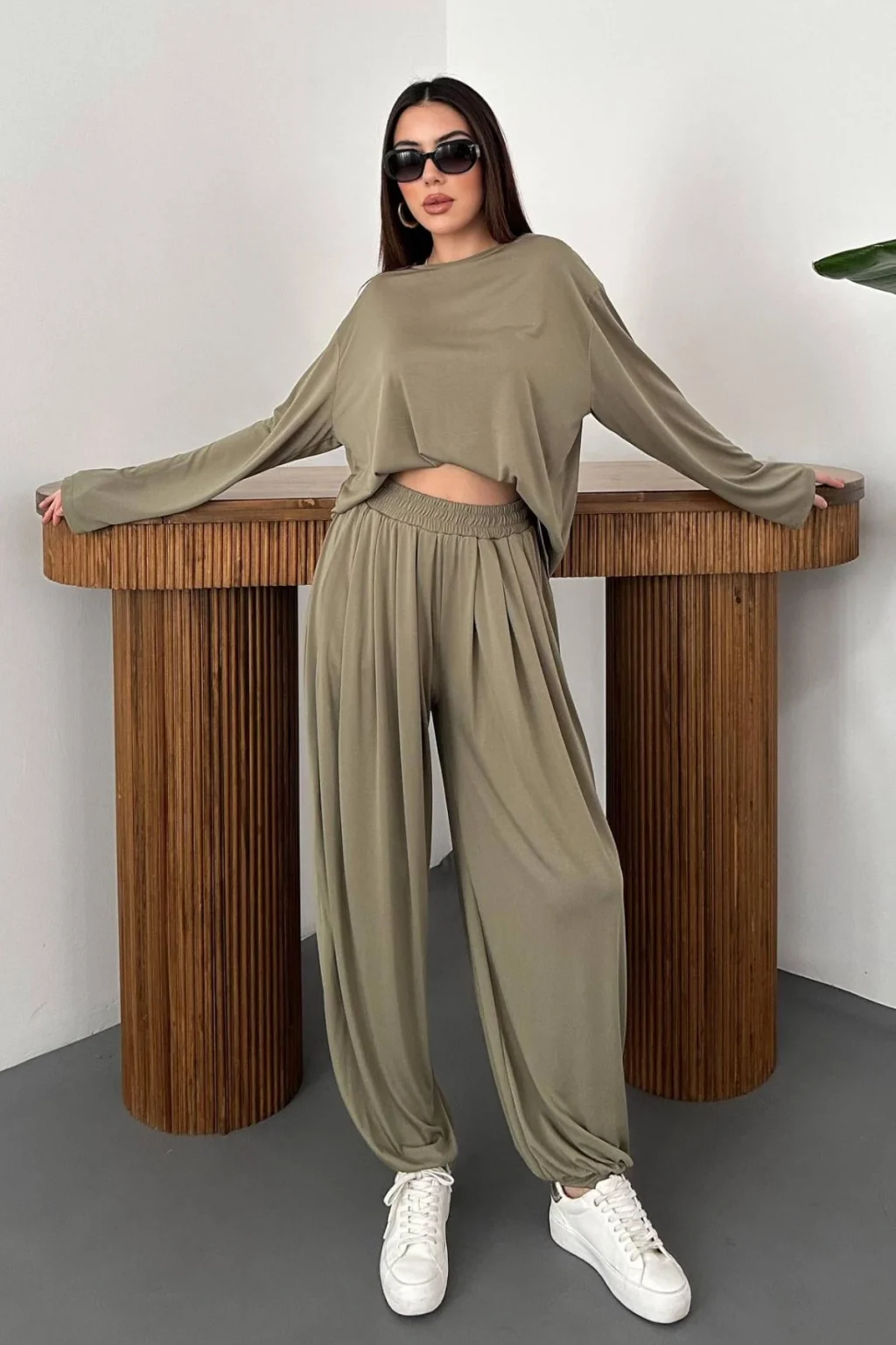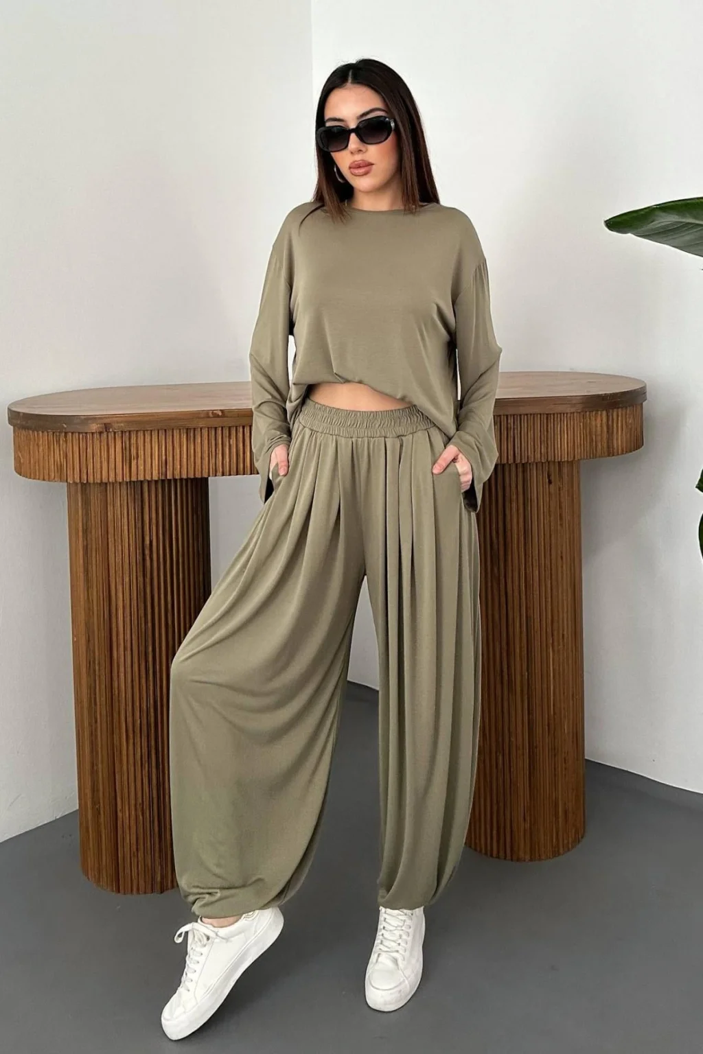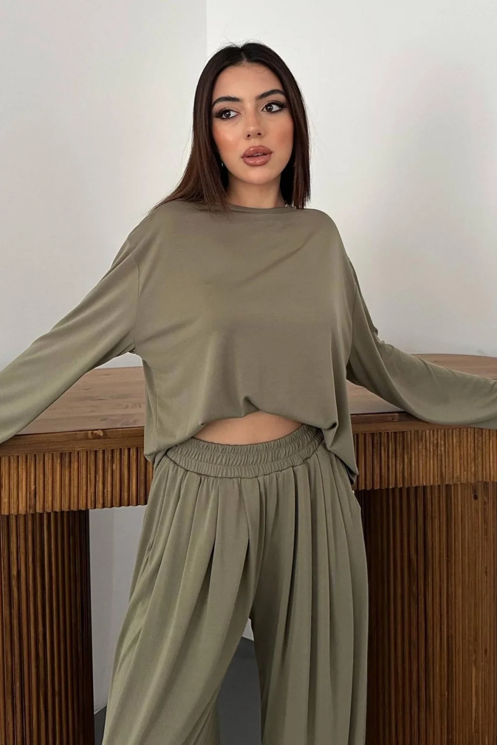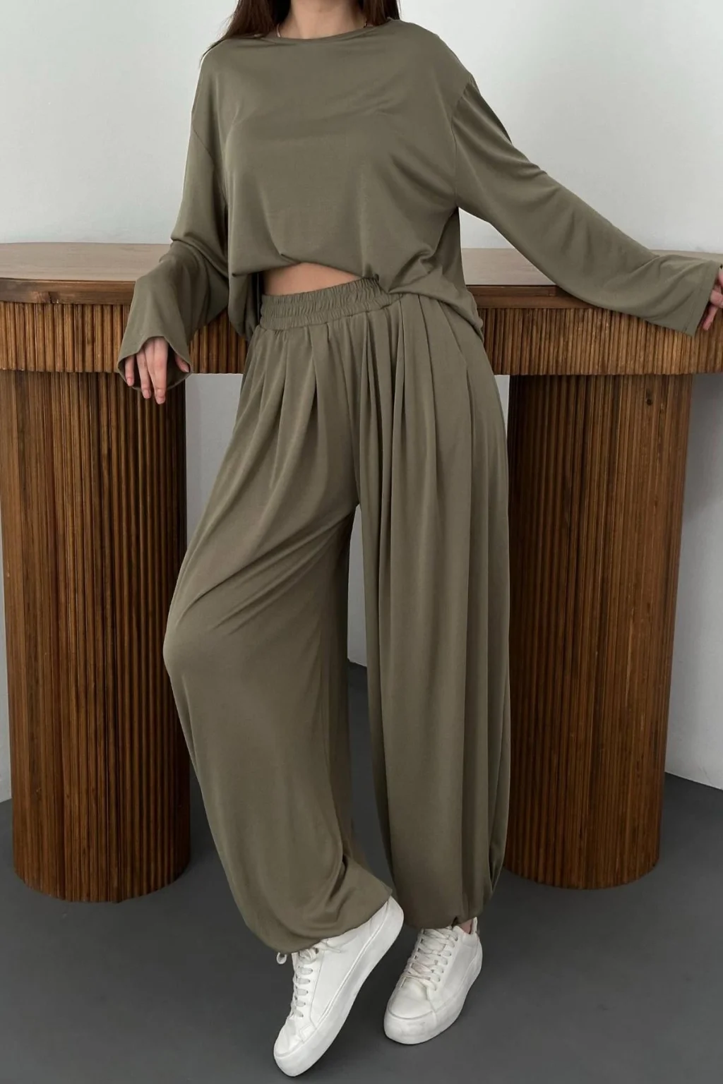 Kadın Şalvarlı Modal Alt Üst Haki Takım