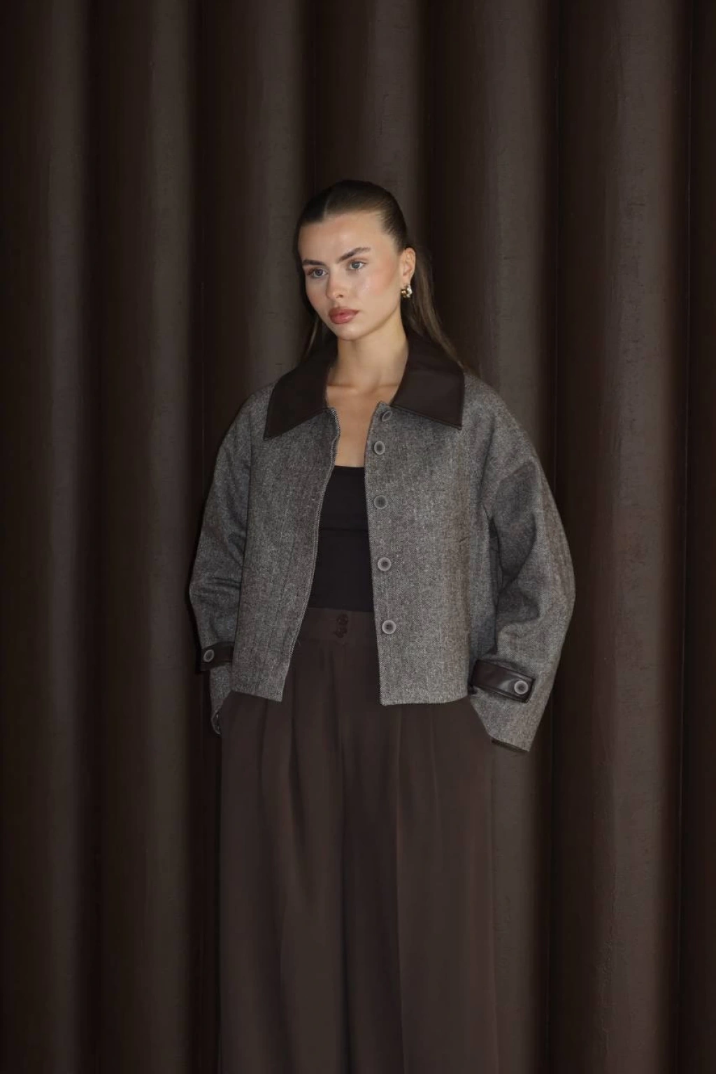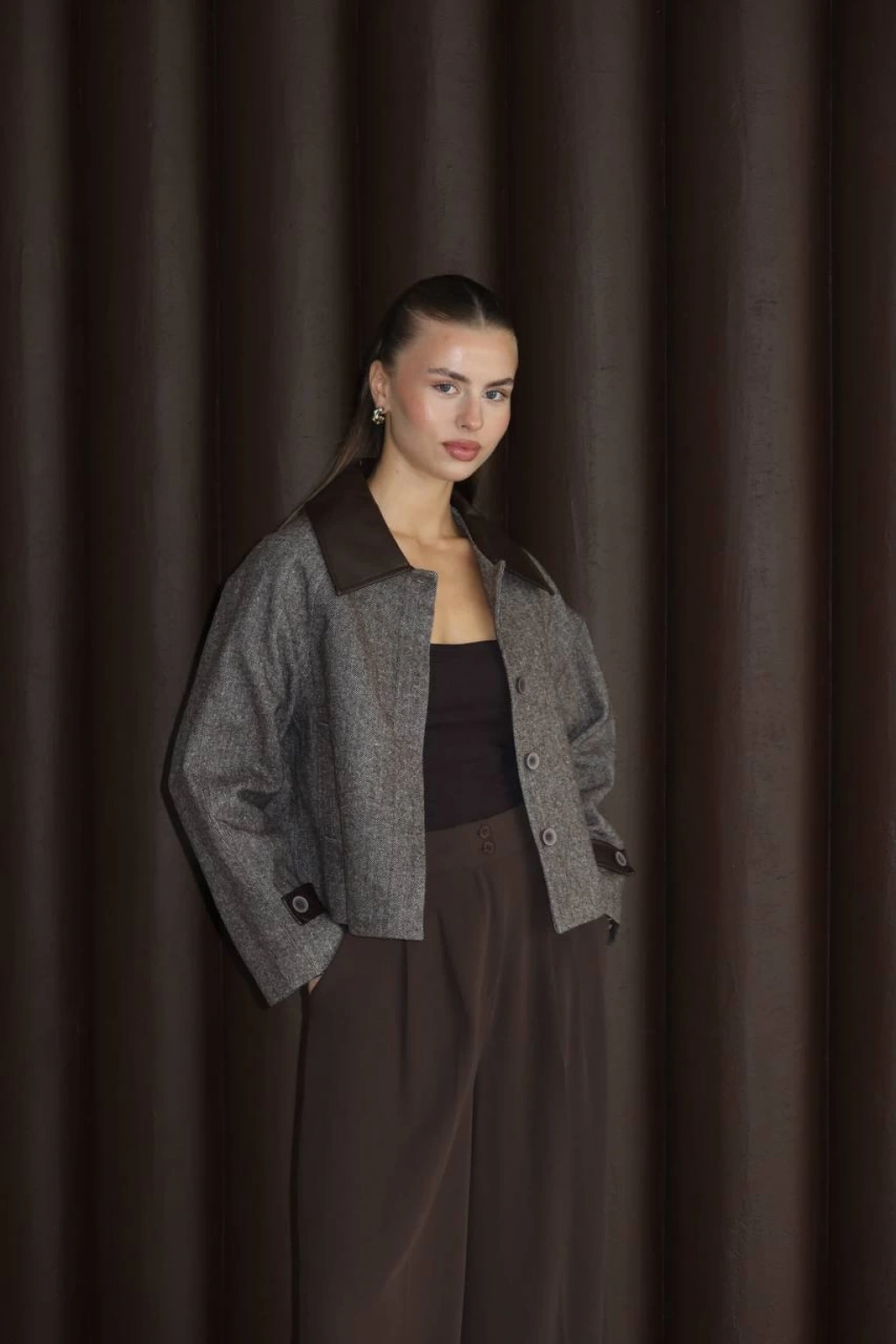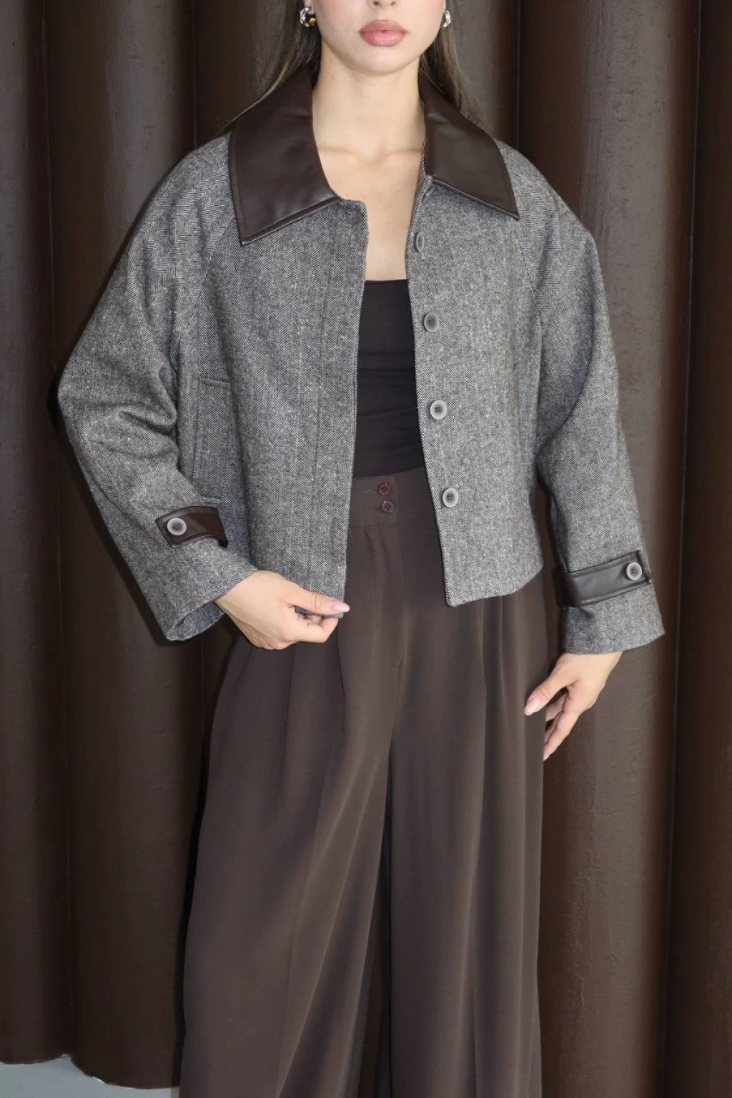 Kadın Suni Deri Garnili Balık Sırtı Ceket