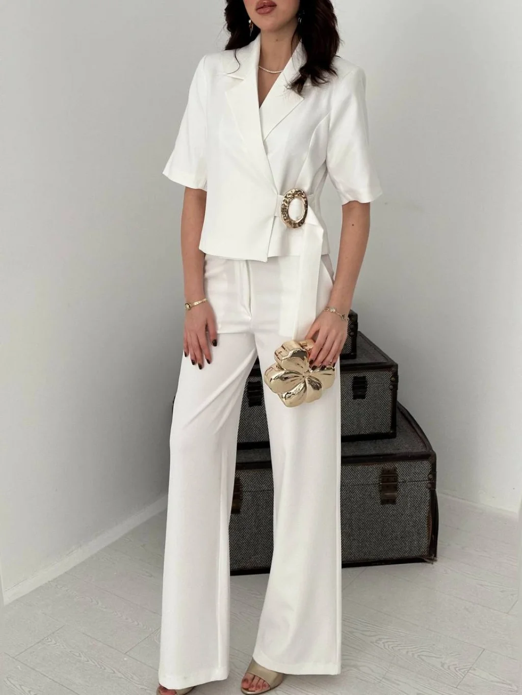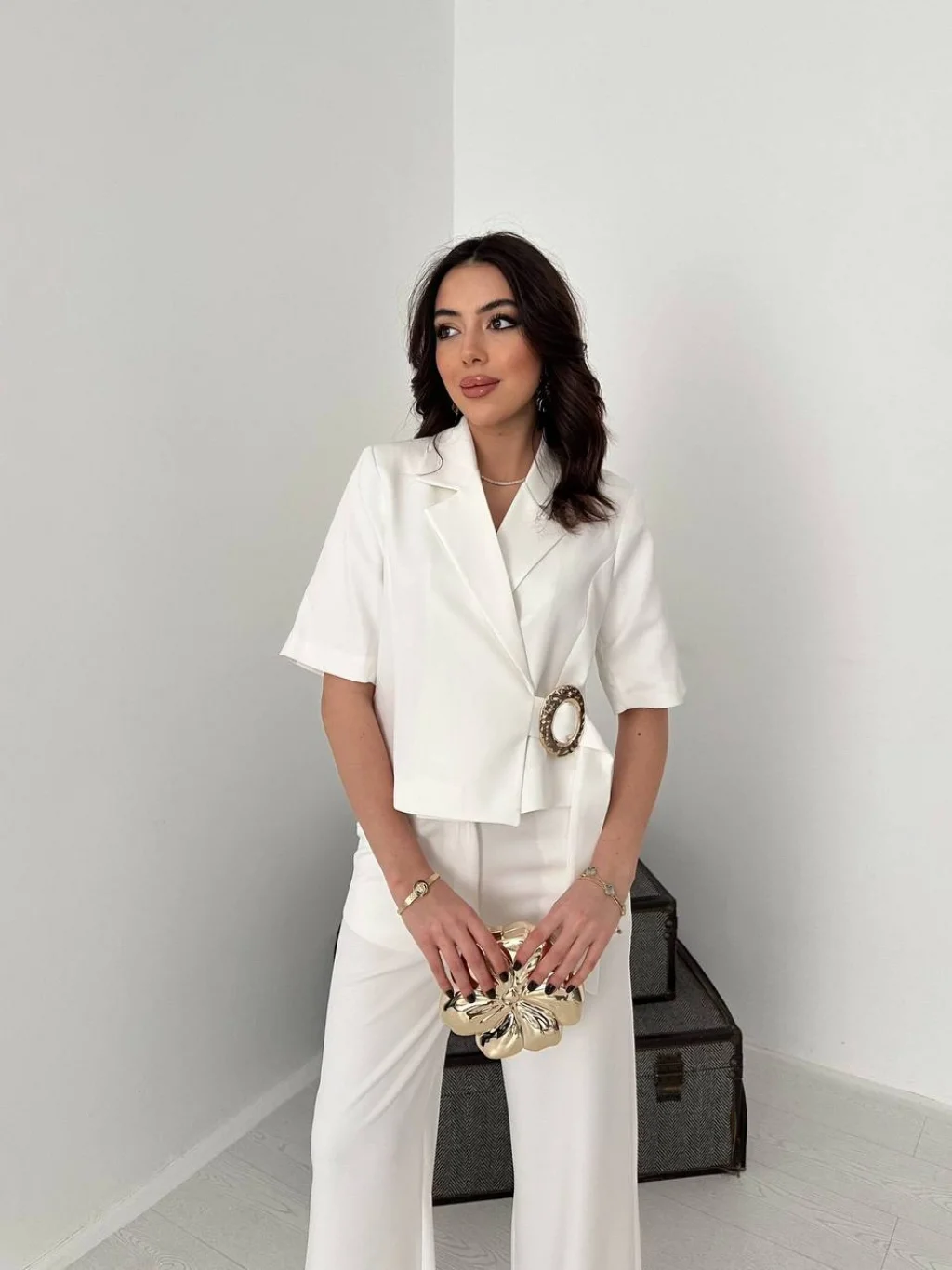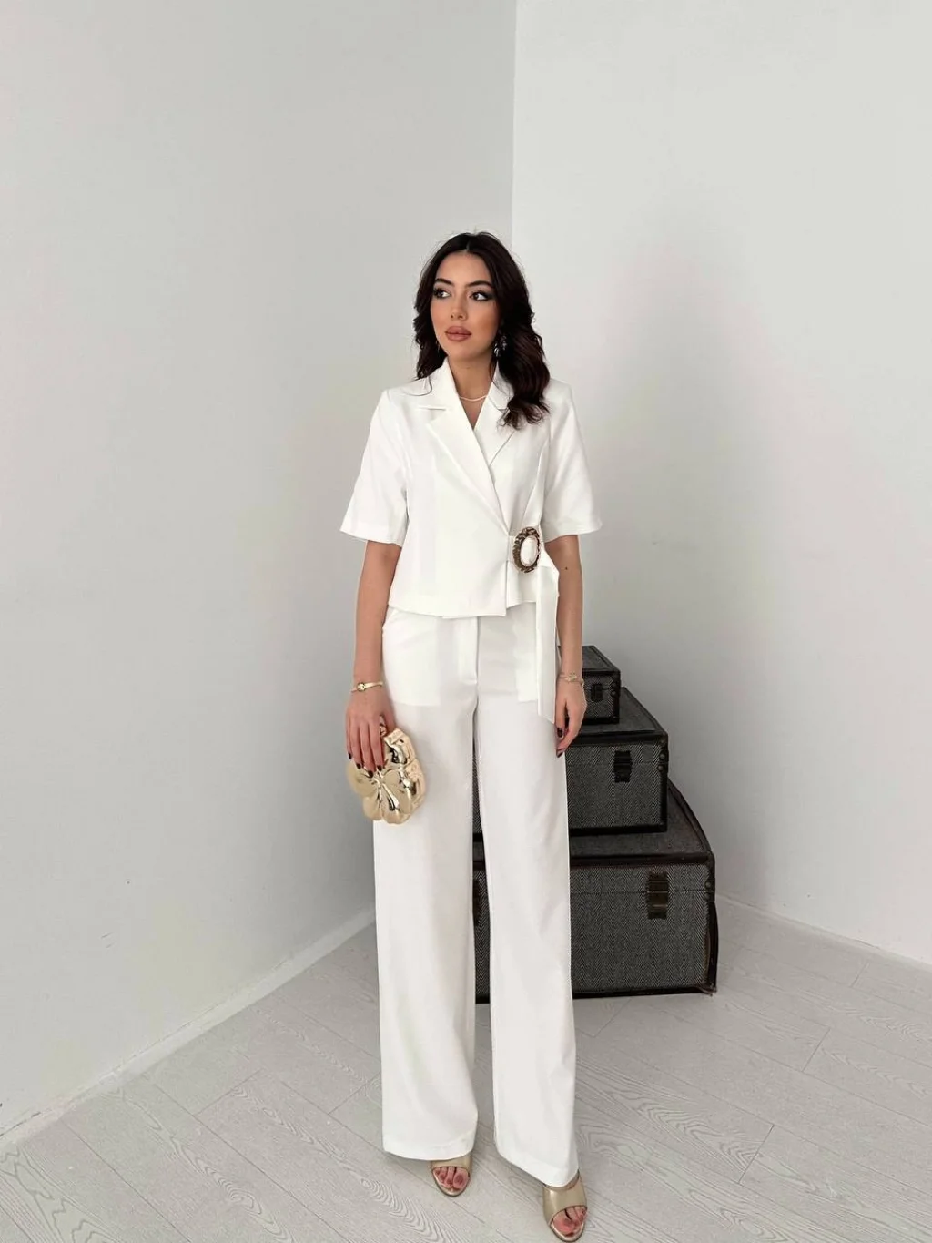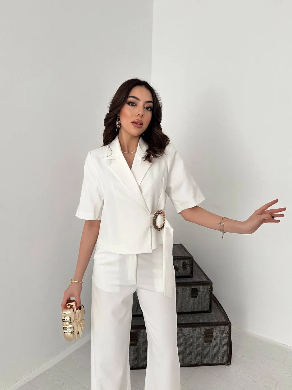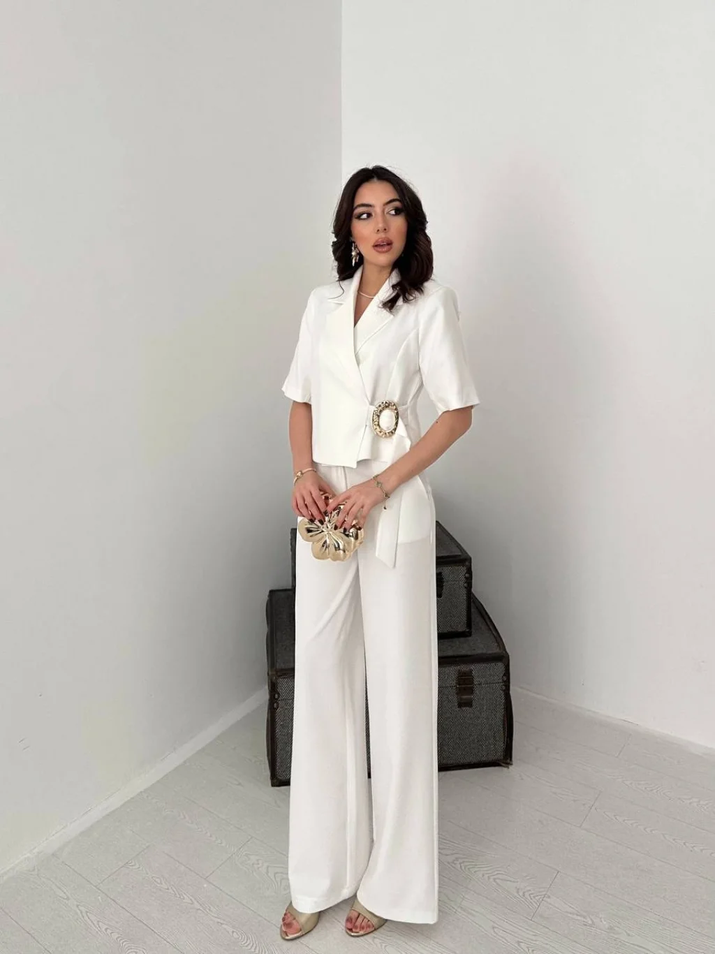 Kadın Toka Detaylı Beyaz Ceket Pantolon Takımı