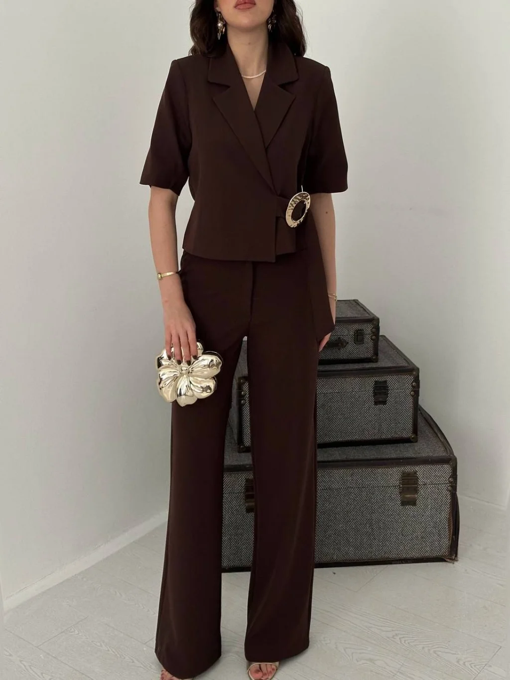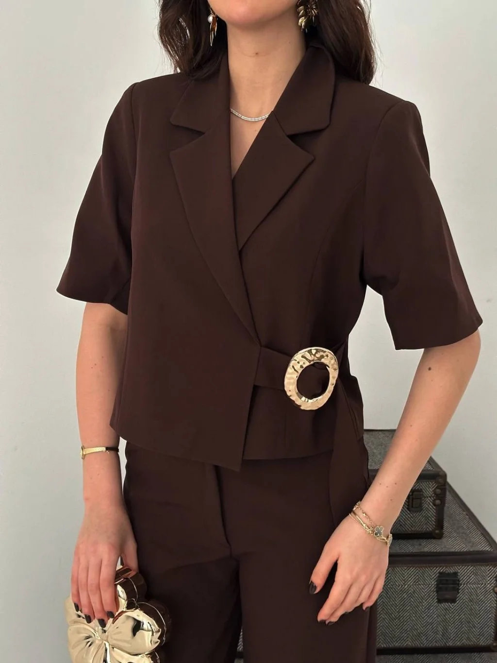Kadın Toka Detaylı Kahverengi Ceket Pantolon Takımı