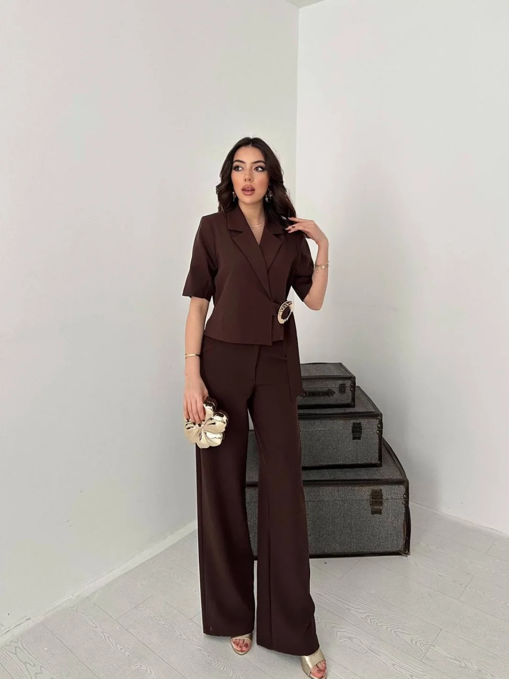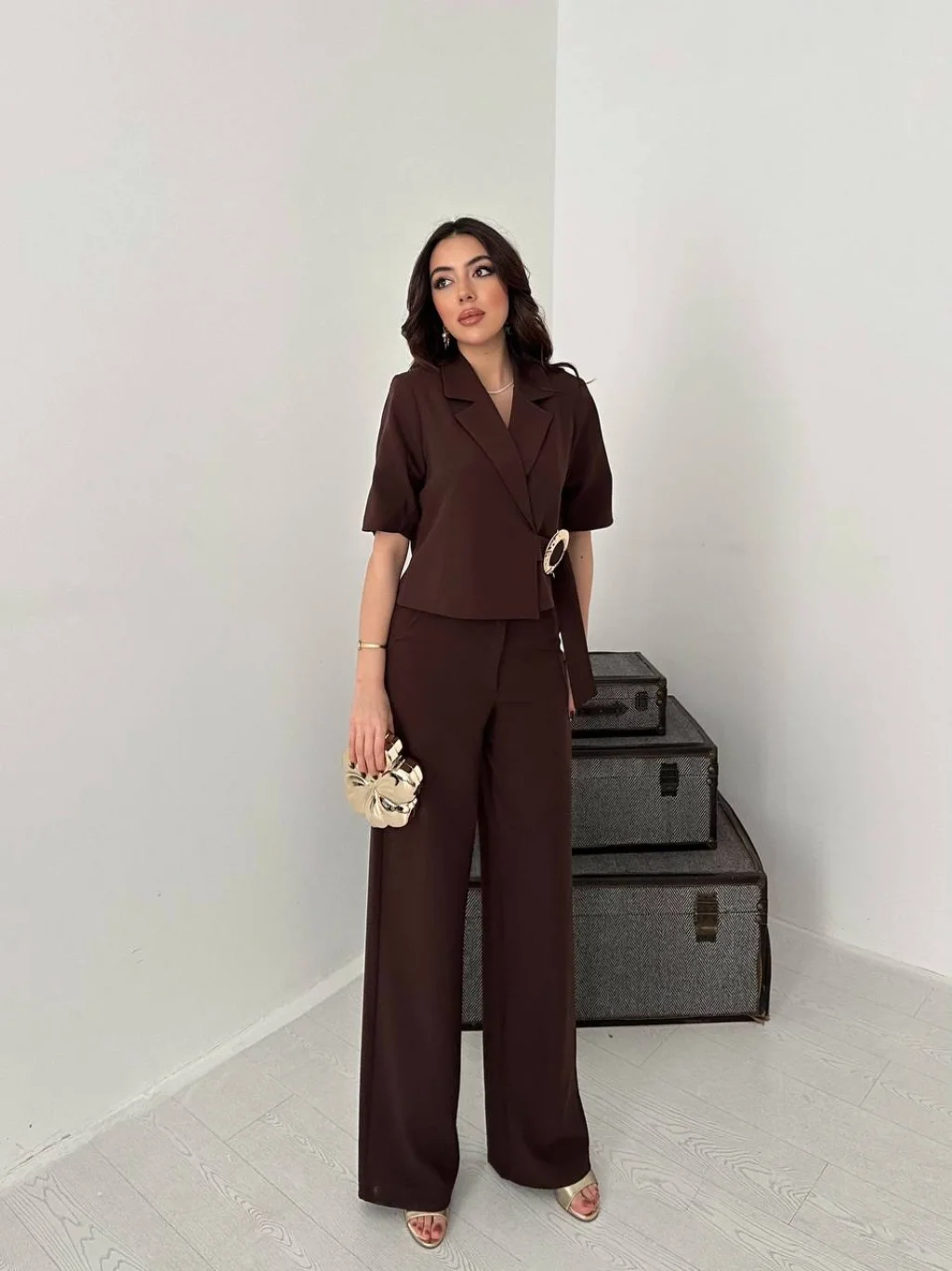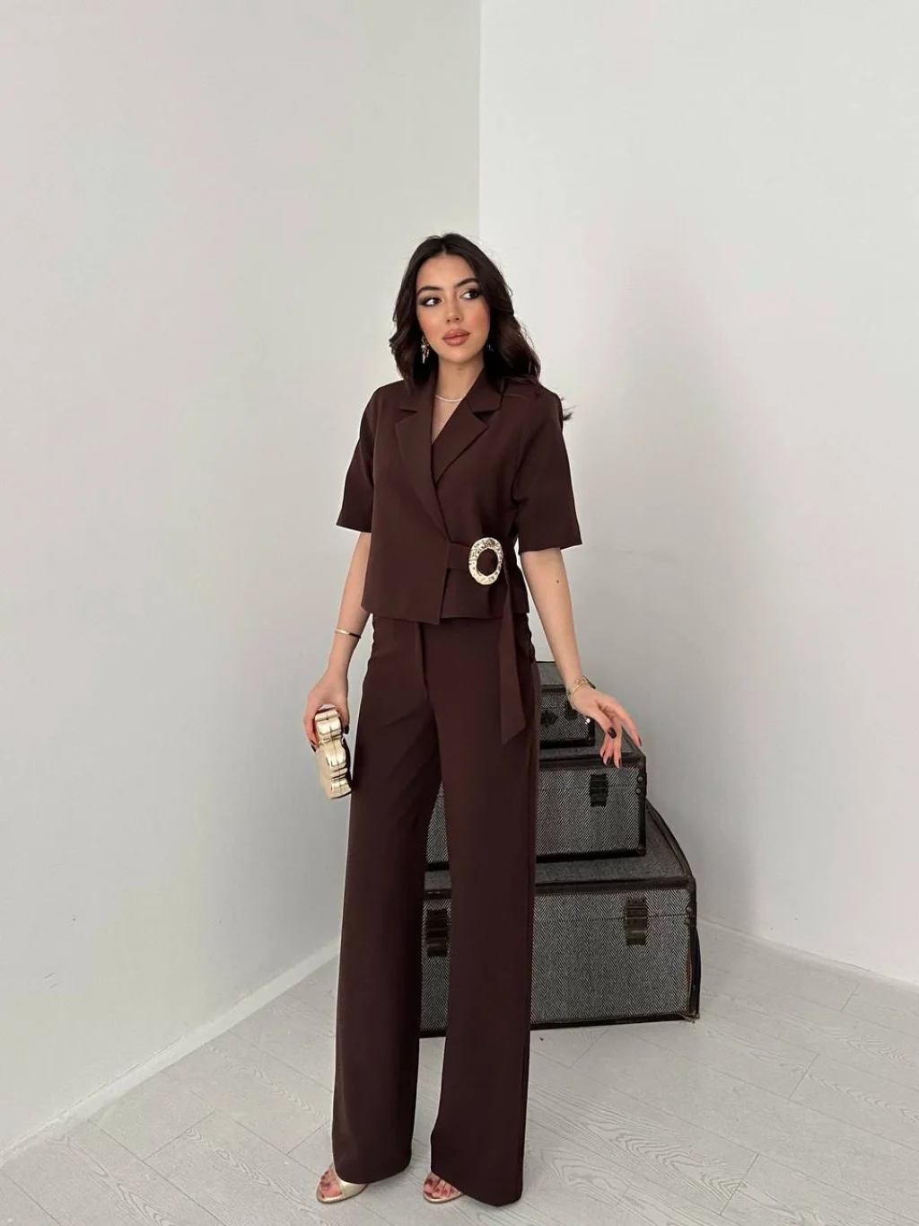 Kadın Toka Detaylı Kahverengi Ceket Pantolon Takımı, modern çizgisi ve zarif tasarımı ile günlük kullanım ve özel günler için ideal bir tercihtir. Şık görünümü ve rahat kalıbı sayesinde stilinizi tamamlamanızı sağlar. Kaliteli kumaş yapısı uzun süreli kullanım için uygundur.