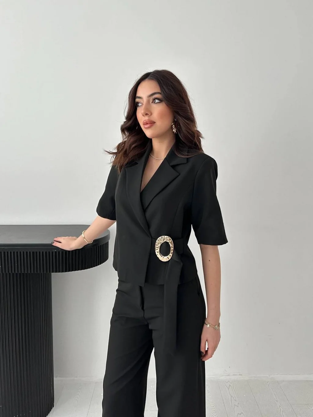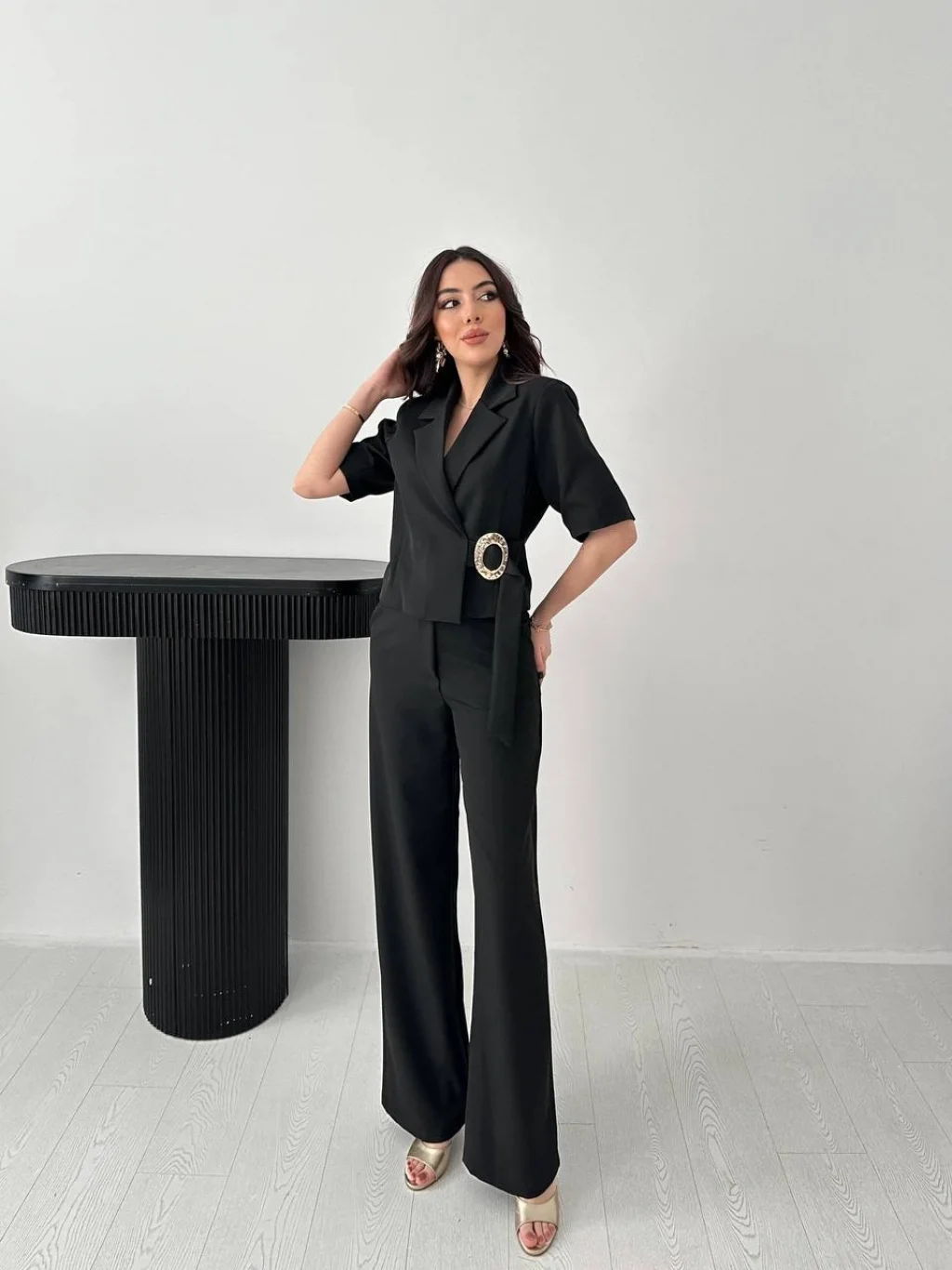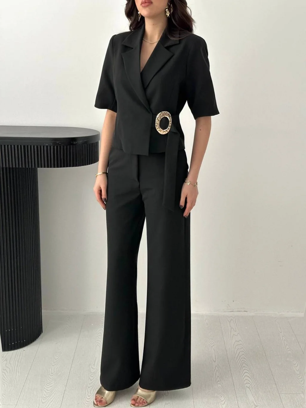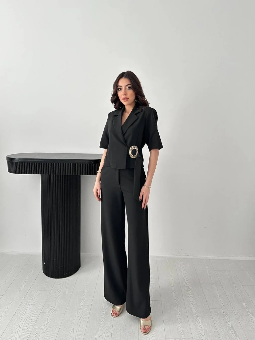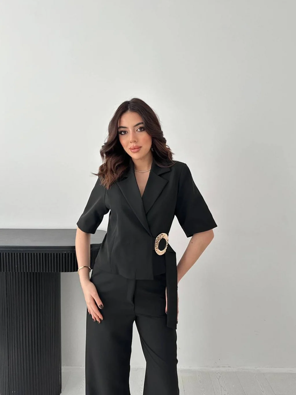 Kadın Toka Detaylı Siyah Ceket Pantolon Takım, modern çizgisi ve zarif tasarımı ile günlük kullanım ve özel günler için ideal bir tercihtir. Şık görünümü ve rahat kalıbı sayesinde stilinizi tamamlamanızı sağlar. Kaliteli kumaş yapısı uzun süreli kullanım için uygundur.