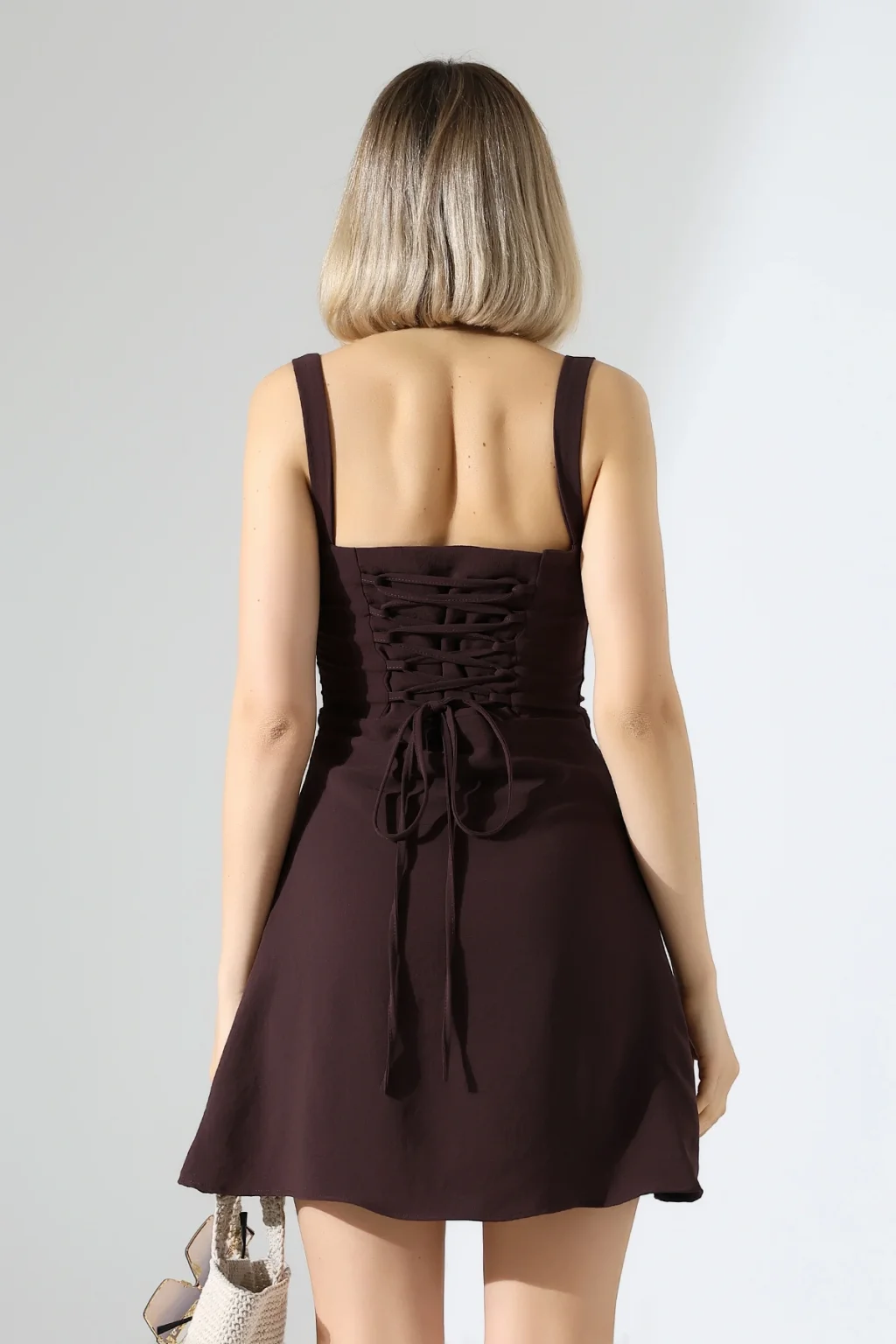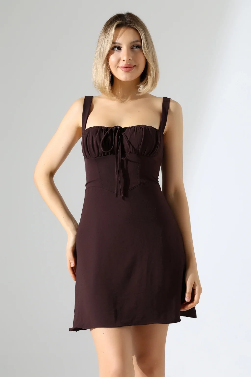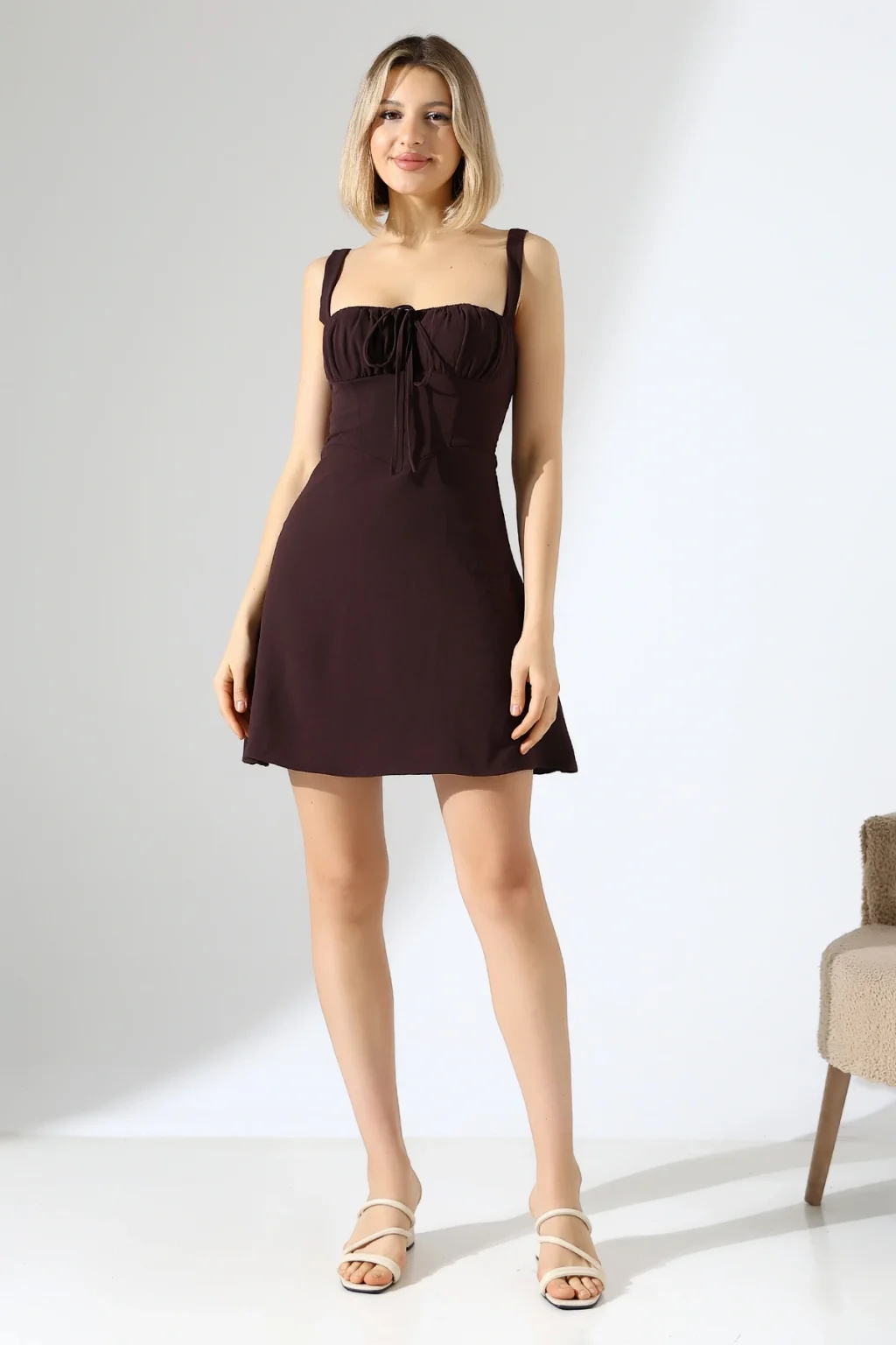 Mini Drapeli Aerobin Astarlı Kahverengi Elbise