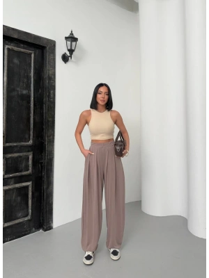 Kadın Yüksek Bel Pileli Kahve Palazzo Pantolon